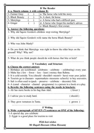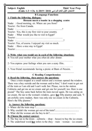 The document provides an English exam practice for third year students, covering language functions like role plays, reading comprehension questions, matching activities about a story, fill in the blanks with grammar and structures, and a writing prompt. It tests various skills like dialogues, expressing feelings, answering questions about a passage, choosing the right grammar, and writing a paragraph on a given topic.