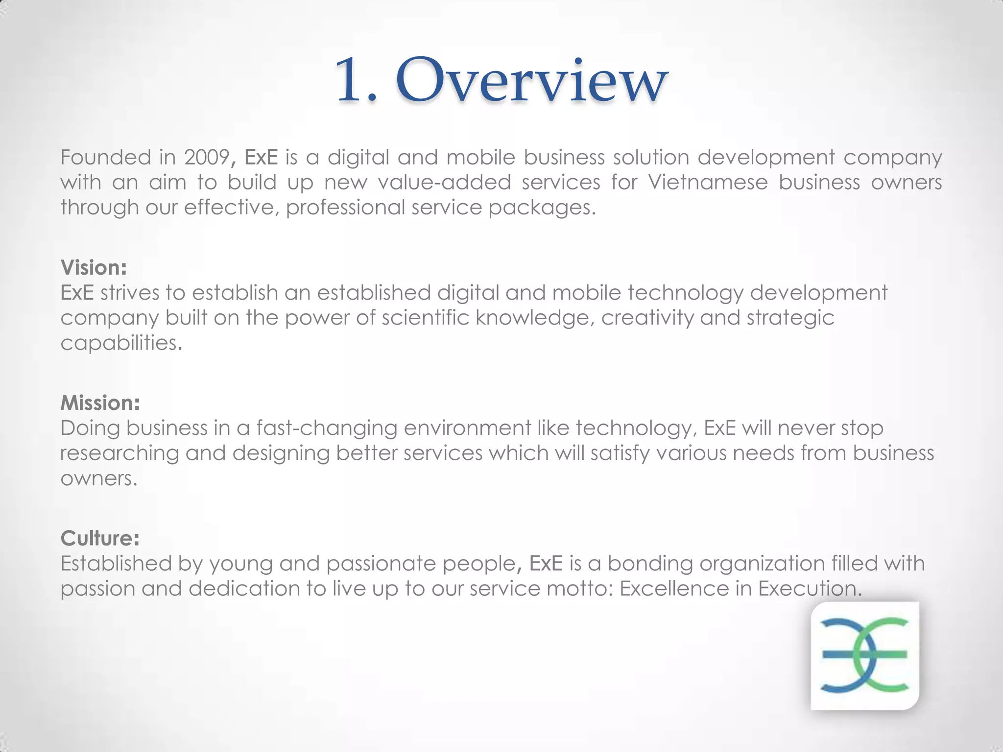 ExE is a digital and mobile business solution development company founded in 2009 in Vietnam. Their vision is to establish themselves as a leading digital and mobile technology development company through scientific knowledge, creativity, and strategic capabilities. Their mission is to continuously research and design better services to satisfy business owners' needs in a fast-changing technological environment. ExE provides services such as web application development, mobile solution development, mobile marketing solutions, and web and online marketing solutions to help businesses succeed.