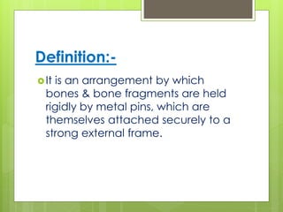 An external fixator is a device used to stabilize broken bones by holding bone fragments rigidly in place with metal pins placed into the bone and connected to an external frame. It is indicated for fractures with significant bone or soft tissue damage. The fixator provides stability against bending, torsion, and axial loads. Application involves planning pin placement, reducing the fracture, drilling pins into the bone, connecting the pins to a frame to align bone fragments, and regularly monitoring the patient's recovery. Complications can include infection, joint stiffness, or damage to surrounding tissues from pin placement.