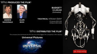 This document provides information about the independent British sci-fi film Ex Machina. It was distributed by Universal Pictures with a budget of $15 million. It was produced by independent British company Film4 and had a theatrical release in the UK in January 2015 and the US in March 2015. The film used various locations in Norway and the UK for filming and employed visual effects in post-production to create the robotic features of the main character Ava. It targeted a niche audience of females and those aged 15-25 with interests in technology and sci-fi.