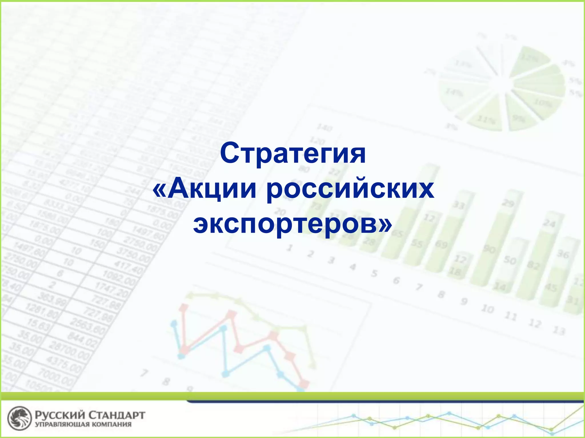Документ описывает стратегию инвестиции в акции российских экспортеров с акцентом на высокую долю экспорта компаний для улучшения финансовых показателей в условиях ослабления рубля. Прогнозируется экономический рост в США и еврозоне, тогда как ВВП России ожидается снижение, что требует диверсификации инвестиций и оценки возможных рисков. Инвестиционная стратегия имеет потенциальную доходность 25% годовых с минимальной суммой инвестиций в 3 млн рублей.