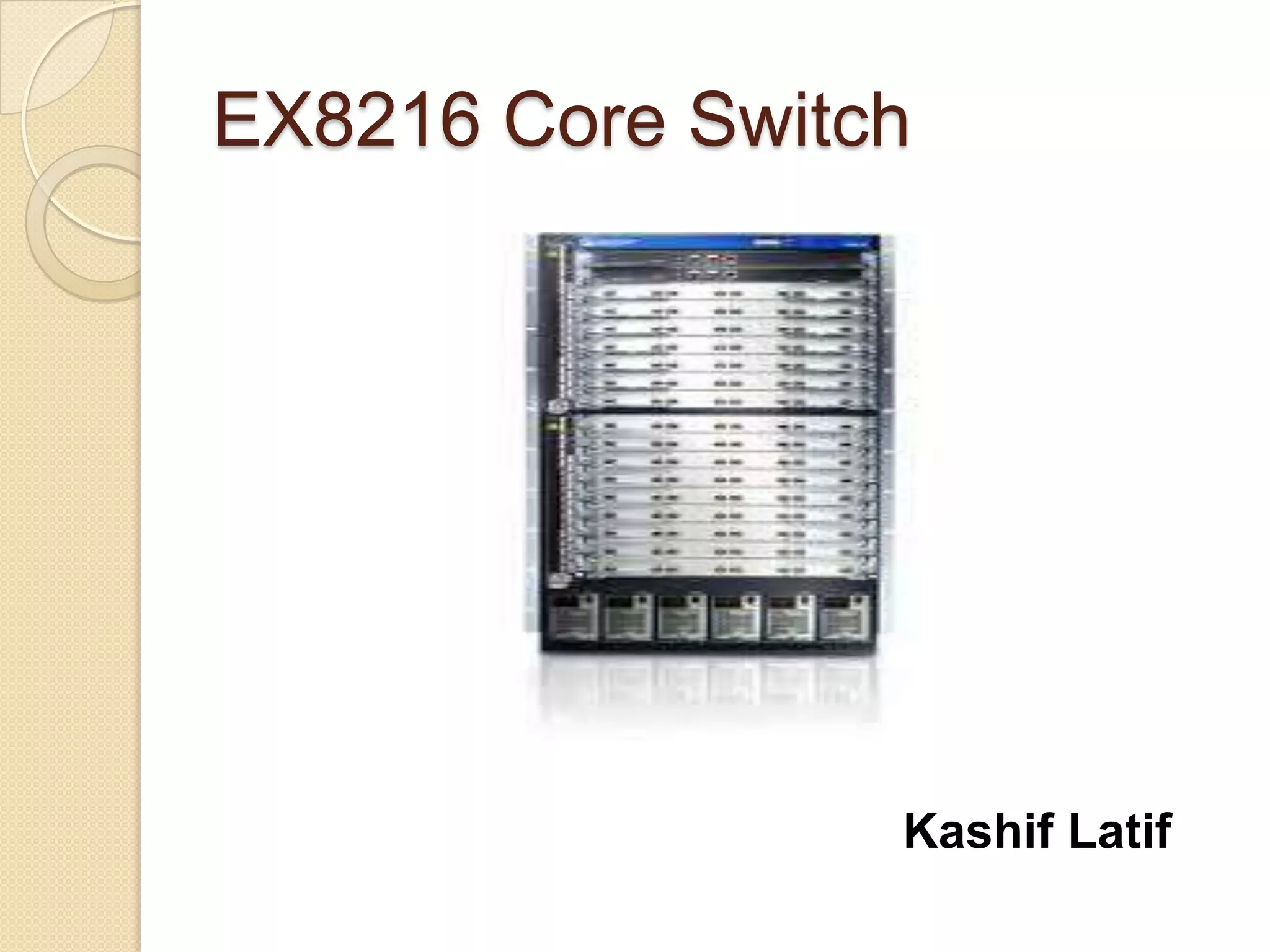 The EX8216 is a modular Ethernet switch designed for high-density environments. It provides high performance, scalable connectivity, and reliability through redundant components including routing engines, switch fabrics, fan trays, and load-sharing power supplies. Key components include the midplane, routing engines, switch fabrics, 16 line card slots, dual fan trays, and redundant power supplies. It can be managed through the same interfaces as other Juniper devices and can be configured into a virtual chassis using an external routing engine.