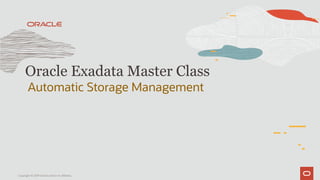 Automatic Storage Management allows Oracle databases to use disk storage that is managed as an integrated cluster file system. It provides functions like striping, mirroring, and rebalancing of data across storage disks. The document outlines new features in Oracle Exadata and Automatic Storage Management including Flex ASM, which eliminates the requirement for an ASM instance on every server, and Flex Disk Groups, which provide file groups and enable quota management and redundancy changes for databases. It also discusses enhancements to disk offline and online operations and rebalancing.
