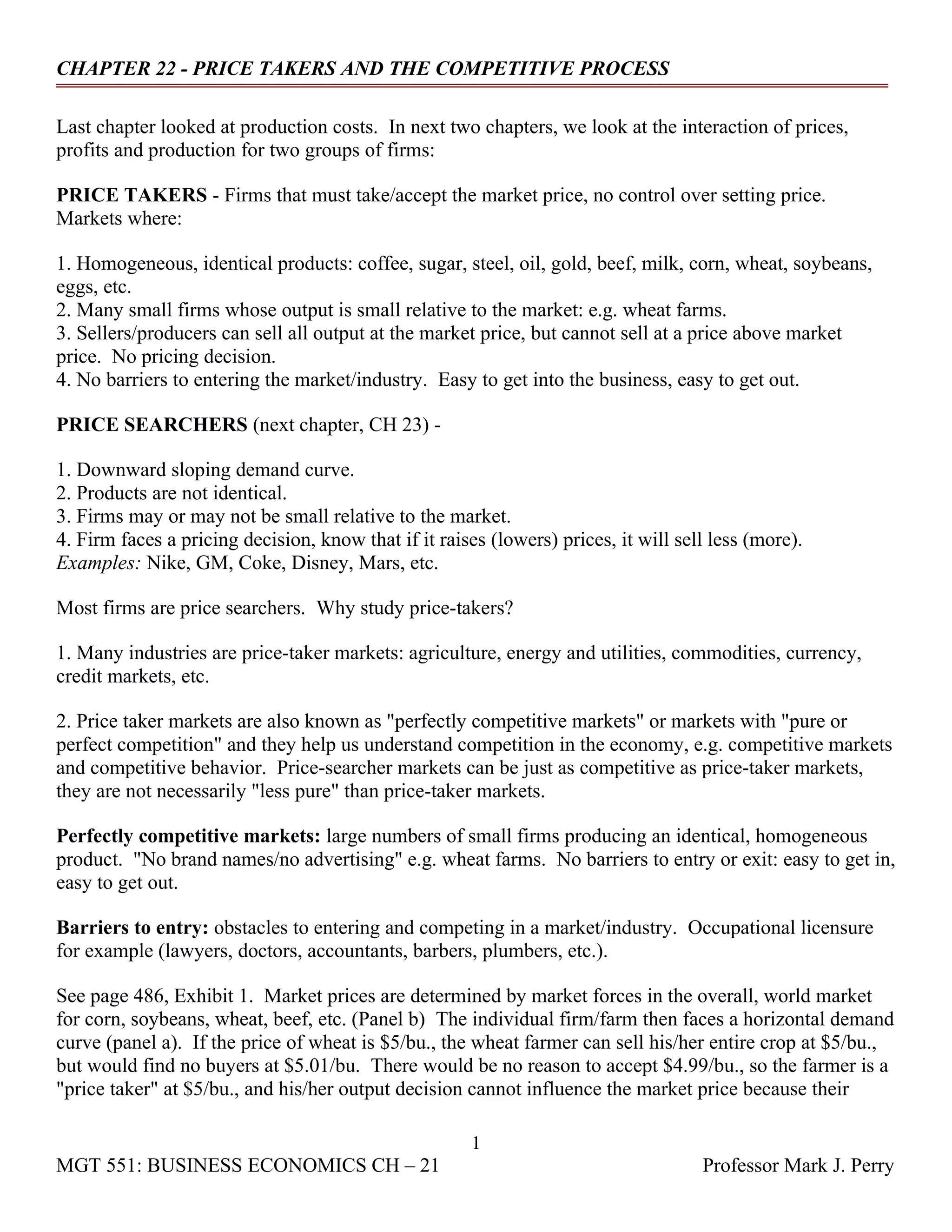 Price takers are firms that must accept the market price and have no control over price setting. Their output is small relative to the market for homogeneous goods like wheat, oil, or beef. Price searchers face a downward sloping demand curve and may be larger firms producing differentiated products like Nike or Coke. Most markets involve price searching firms. Perfect competition in price taker markets leads to efficient resource allocation and benefits consumers through low prices and new firm entry. Profits and losses communicate market signals, rewarding efficient firms and penalizing inefficient ones. This competitive process improves productivity and living standards over the long run.