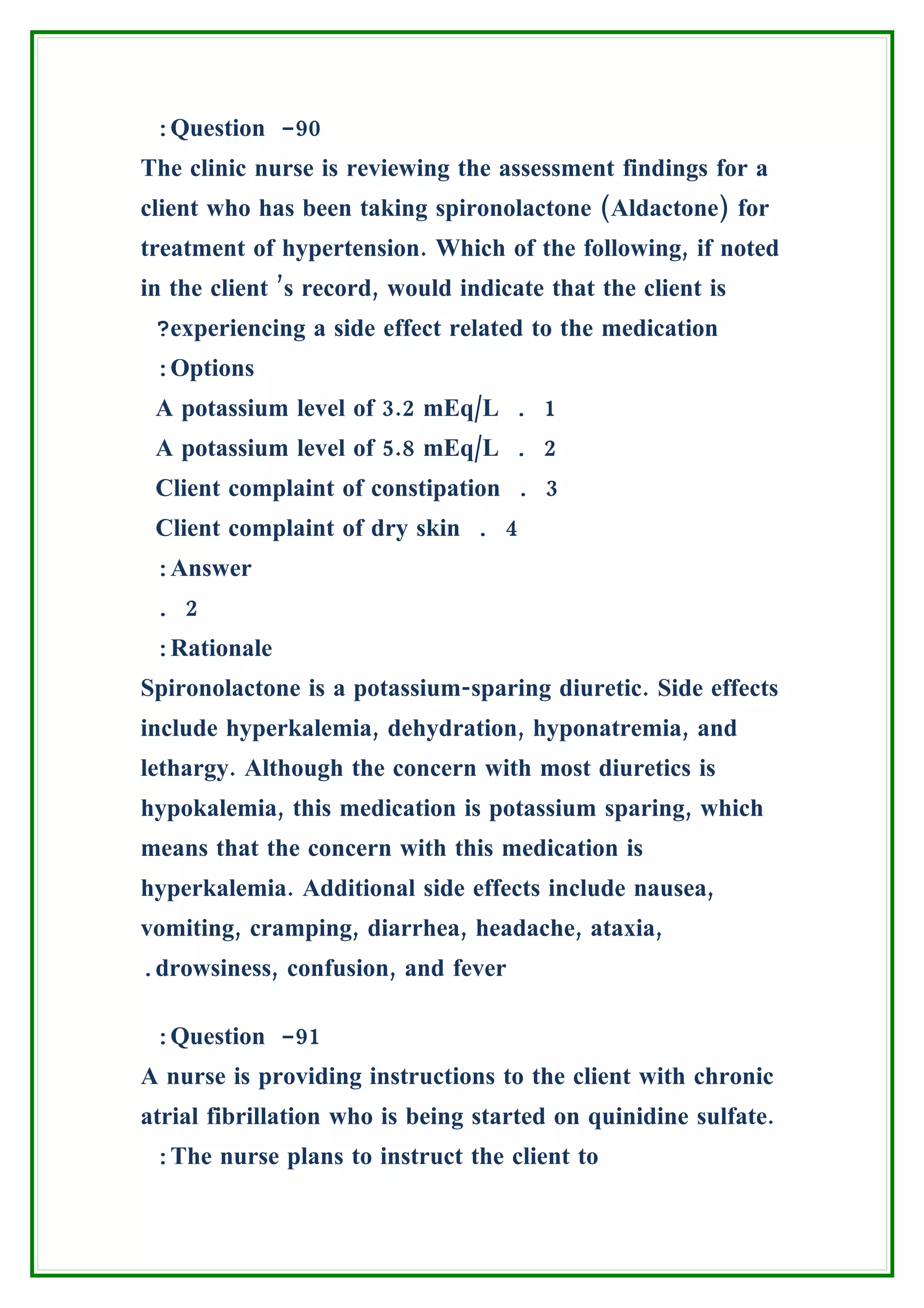 The document contains questions and answers related to cardiovascular nursing care. A client taking spironolactone was found to have a potassium level of 5.8 mEq/L, indicating hyperkalemia as a side effect of the medication. Instructions for a client taking quinidine sulfate include not chewing sustained-release capsules. A PR interval of 0.20 second on an ECG is a normal finding.