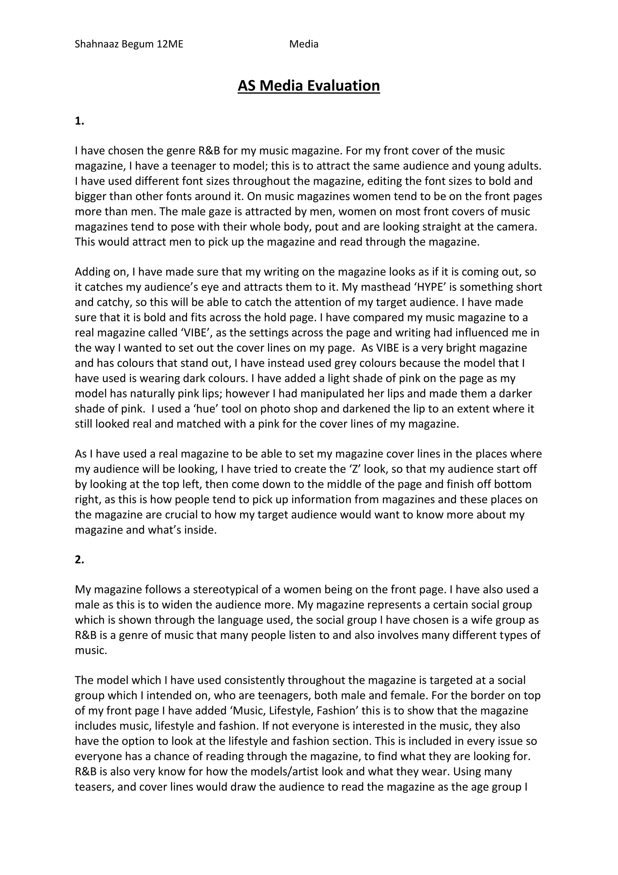 1. The document describes the creation of a music magazine targeting teenagers and young adults. Key details include using a teenage model on the cover to attract the target audience, and manipulating photos in Photoshop, such as darkening the model's lip color.