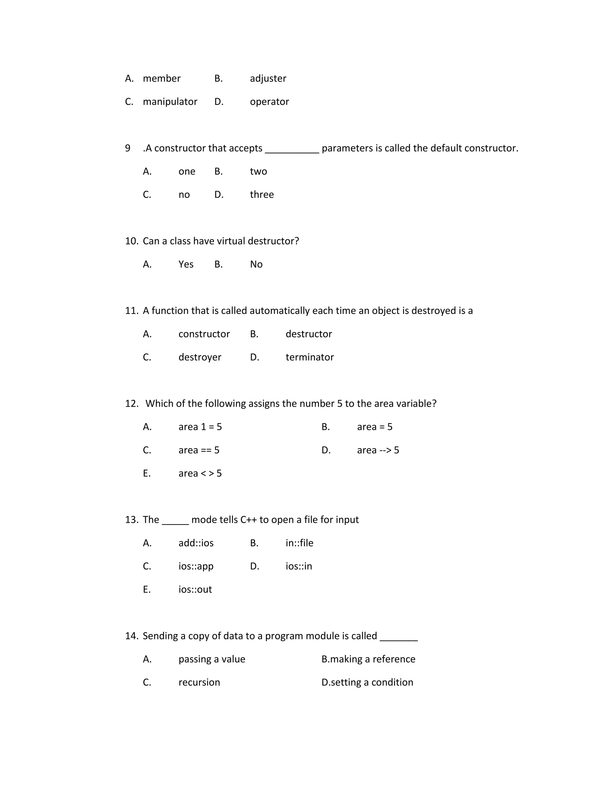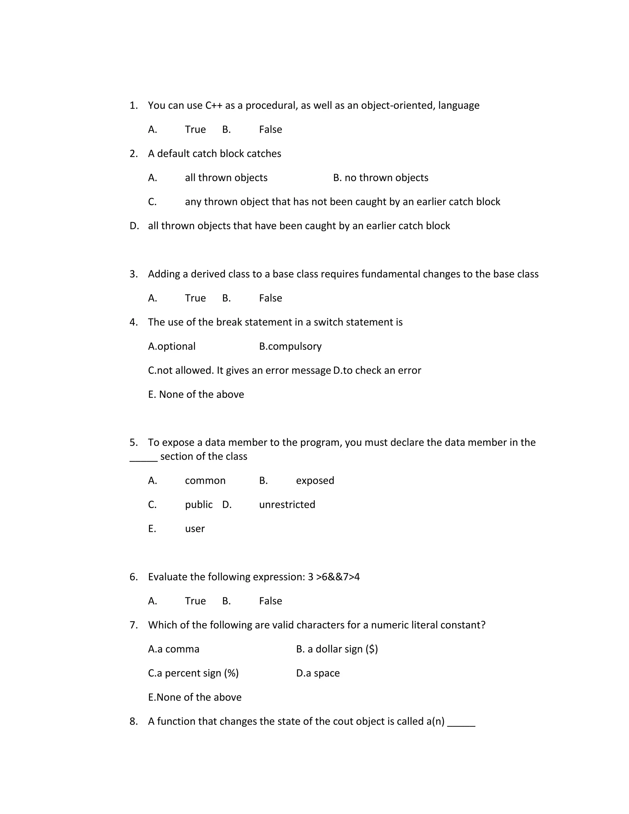 The document contains 35 multiple choice questions testing C++ programming knowledge. The questions cover topics such as object-oriented programming, classes, functions, operators, I/O, data types, arrays, pointers, structures, and algorithms. The correct answer is provided for each question.
