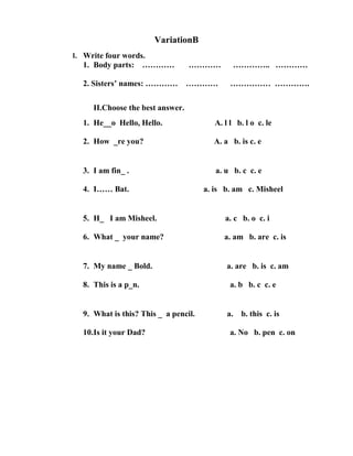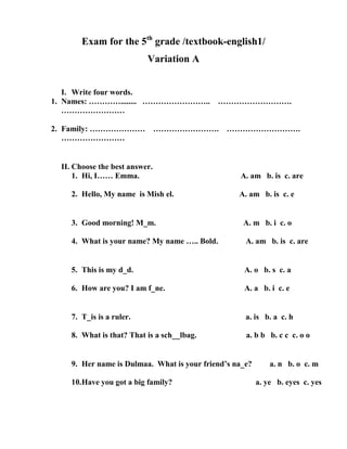 This document contains two variations of an exam for 5th grade students testing their English language skills. Each variation includes sections to test vocabulary by filling in blanks, and choosing the best answer to complete sentences. The questions cover topics like names, family members, colors, animals, body parts, clothing, seasons, and basic grammar. The exam is designed to evaluate students' understanding of foundational English words and sentence structures.