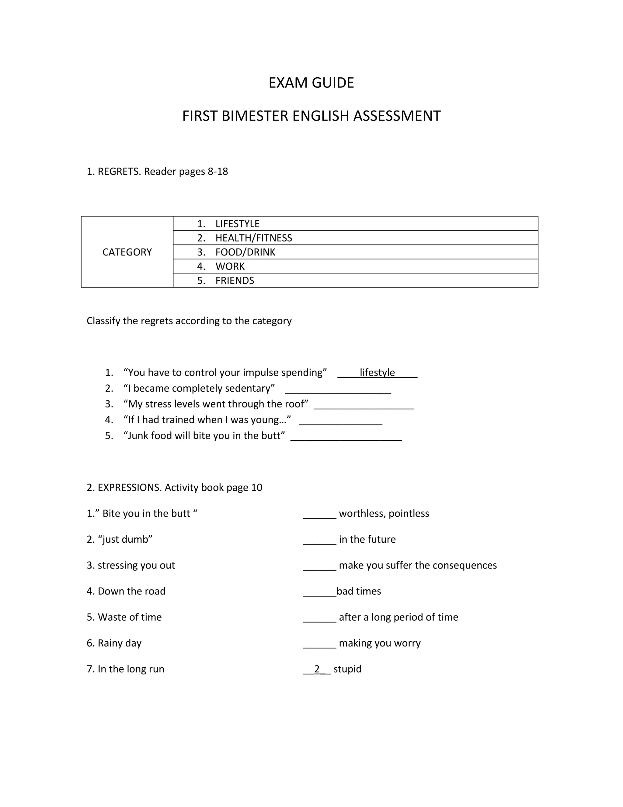 This document provides an exam guide for a first bimester English assessment. It includes instructions to classify regrets according to categories, identify meanings of expressions, complete sentences in the third conditional structure, analyze parts of a complaint letter, and answer reading comprehension questions about the book Dracula.