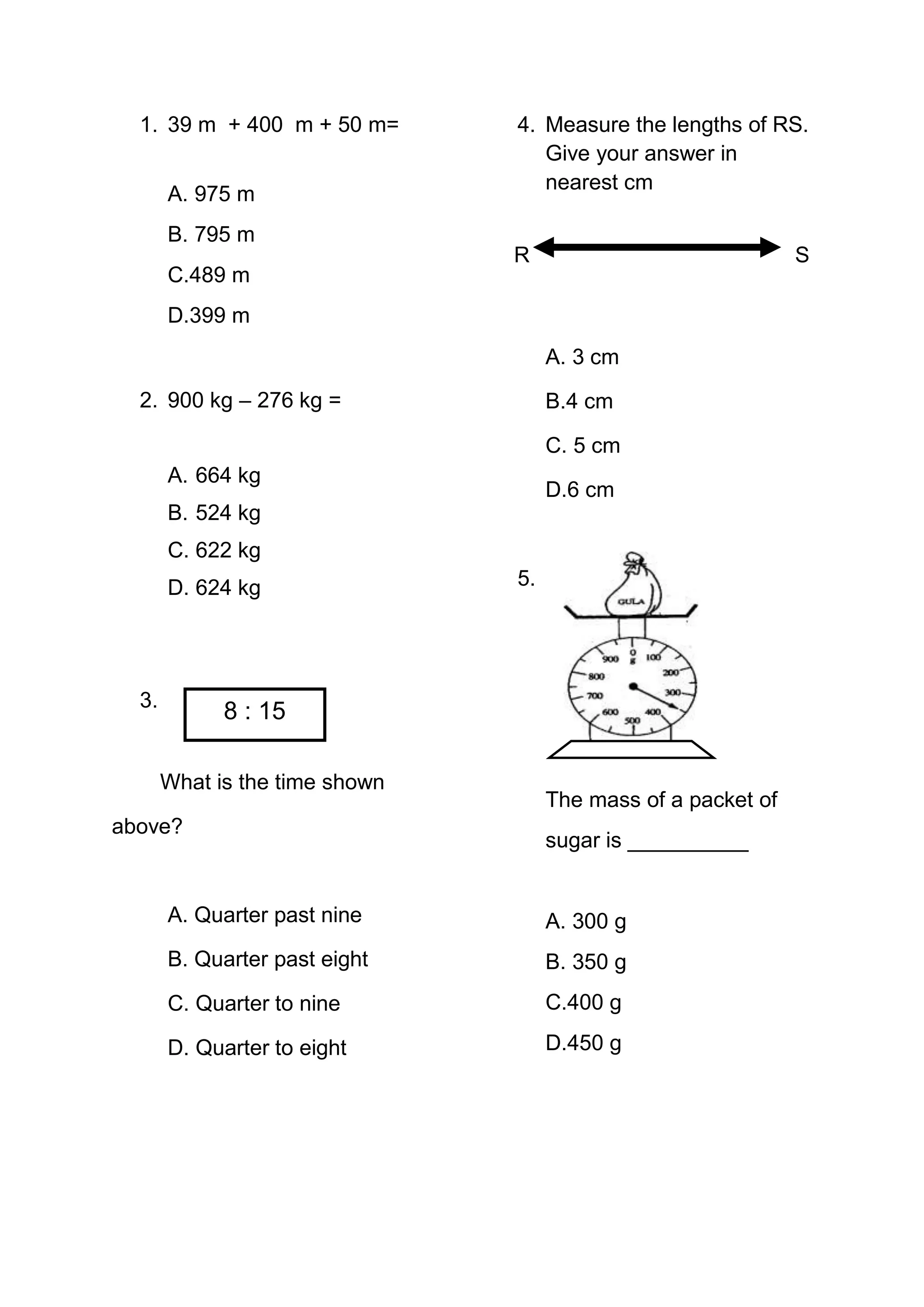 1. The document contains 40 multiple choice questions about math, time, measurement, and word problems.