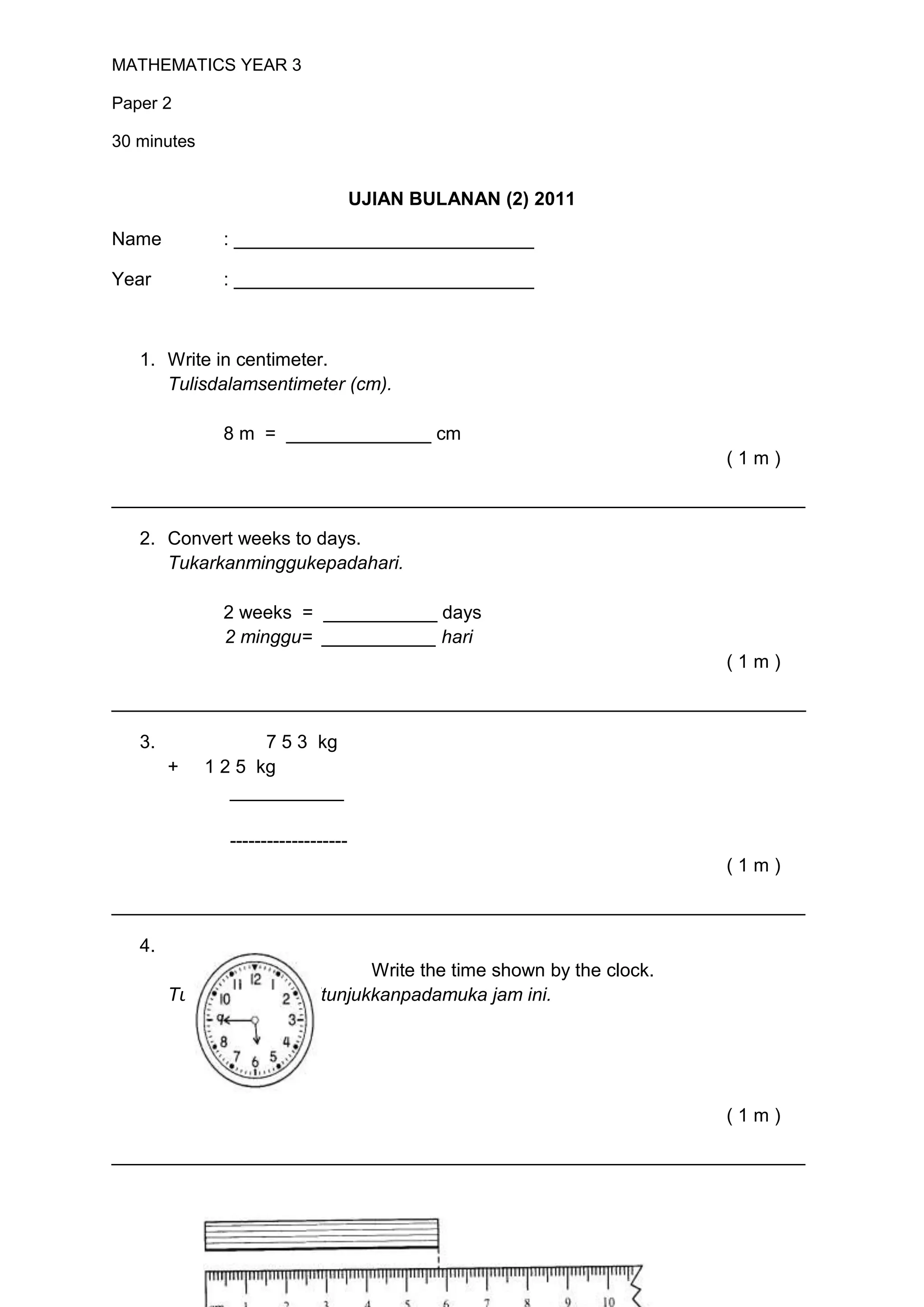 1. The document contains a mathematics test for year 3 students with 20 multiple choice and problem solving questions covering topics like: conversions between units (meters to centimeters, weeks to days), addition, subtraction, multiplication, division, time, mass, and word problems.