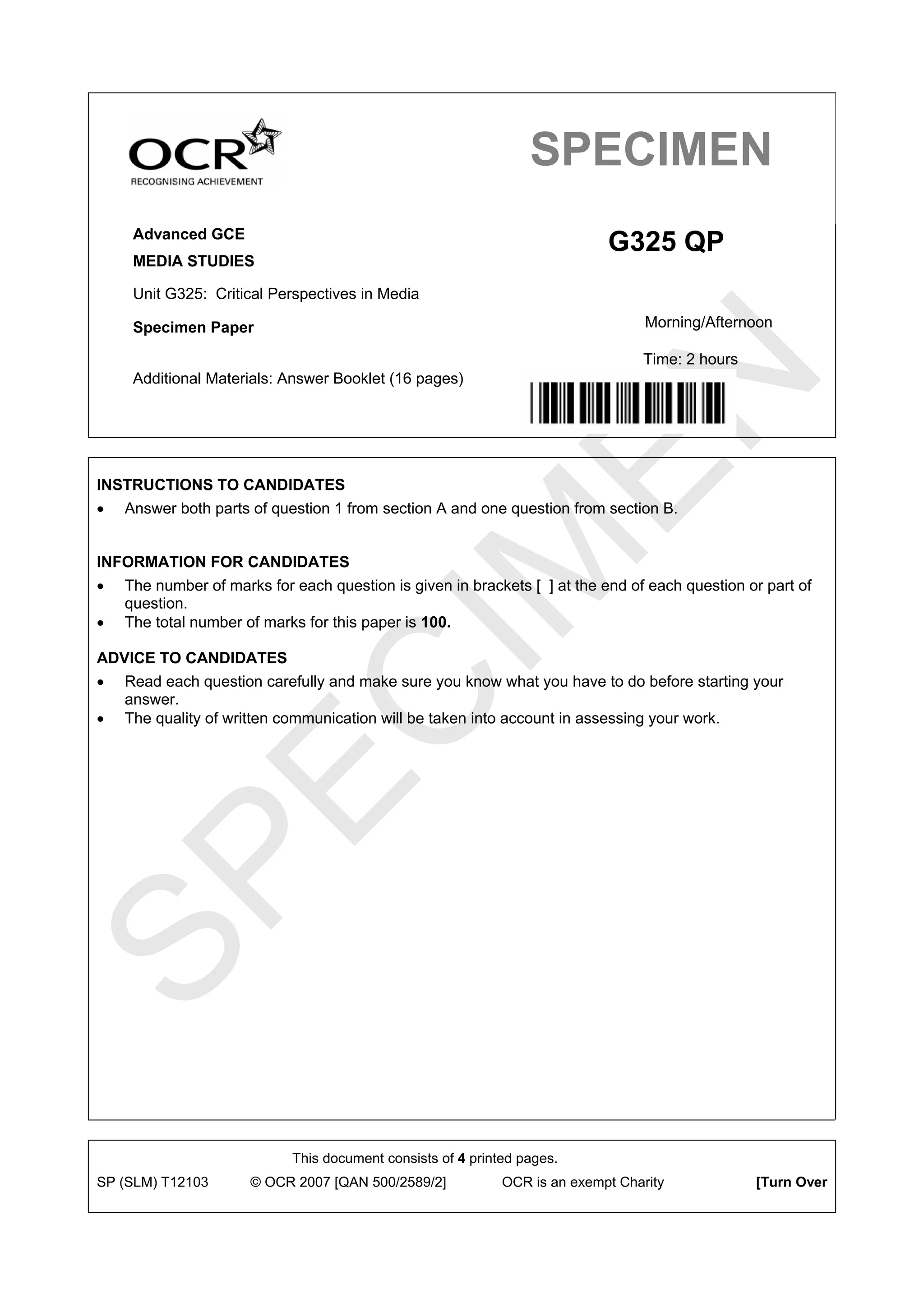 This document is a specimen paper for the Advanced GCE Media Studies exam. It consists of two sections: Section A involves theoretical evaluation of media productions and Section B involves answering questions about contemporary media issues. The paper is worth a total of 100 marks and tests students' understanding of critical media concepts and theories.