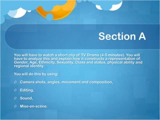 This document provides guidance on analyzing representations in TV dramas through various film techniques. It discusses analyzing a 4-5 minute TV drama clip to examine how it constructs representations of gender, age, ethnicity, sexuality, class, ability, and identity. The analysis should consider camera shots, angles, movement and composition; editing techniques; sound; and mise-en-scène. It then provides definitions and examples of these various filmmaking techniques to consider in the analysis.