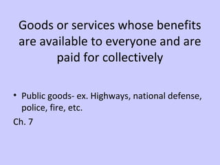 2. Public goods are goods or services whose benefits are available to everyone and are paid for collectively, such as highways, national defense, police, fire services.
