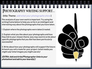 The document provides instructions for students to present photographs on A2 boards with short explanations linked to their theme. It also instructs students to complete their second artist board using the provided sheet to link their work to an artist, and suggests taking their own photograph in the style of the artist. Finally, it prompts students to choose photographs to use for observational artwork the following week and print them at A4 size.