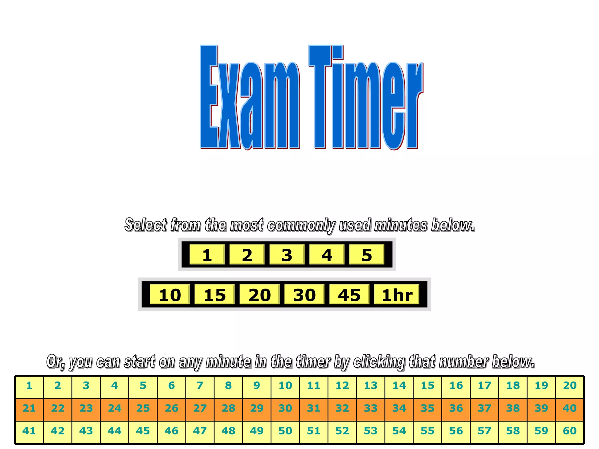 Select from themost commonly used minutes below. 1 2 3 4 5 10 15 20 30 1hr 45 Or, you can start on any minute in the timer by clicking that number below. Exam Timer 60 59 58 57 56 55 54 53 52 51 50 49 48 47 46 45 44 43 42 41 40 39 38 37 36 35 34 33 32 31 30 29 28 27 26 25 24 23 22 21 20 19 18 17 16 15 14 13 12 11 10 9 8 7 6 5 4 3 2 1 - 2.