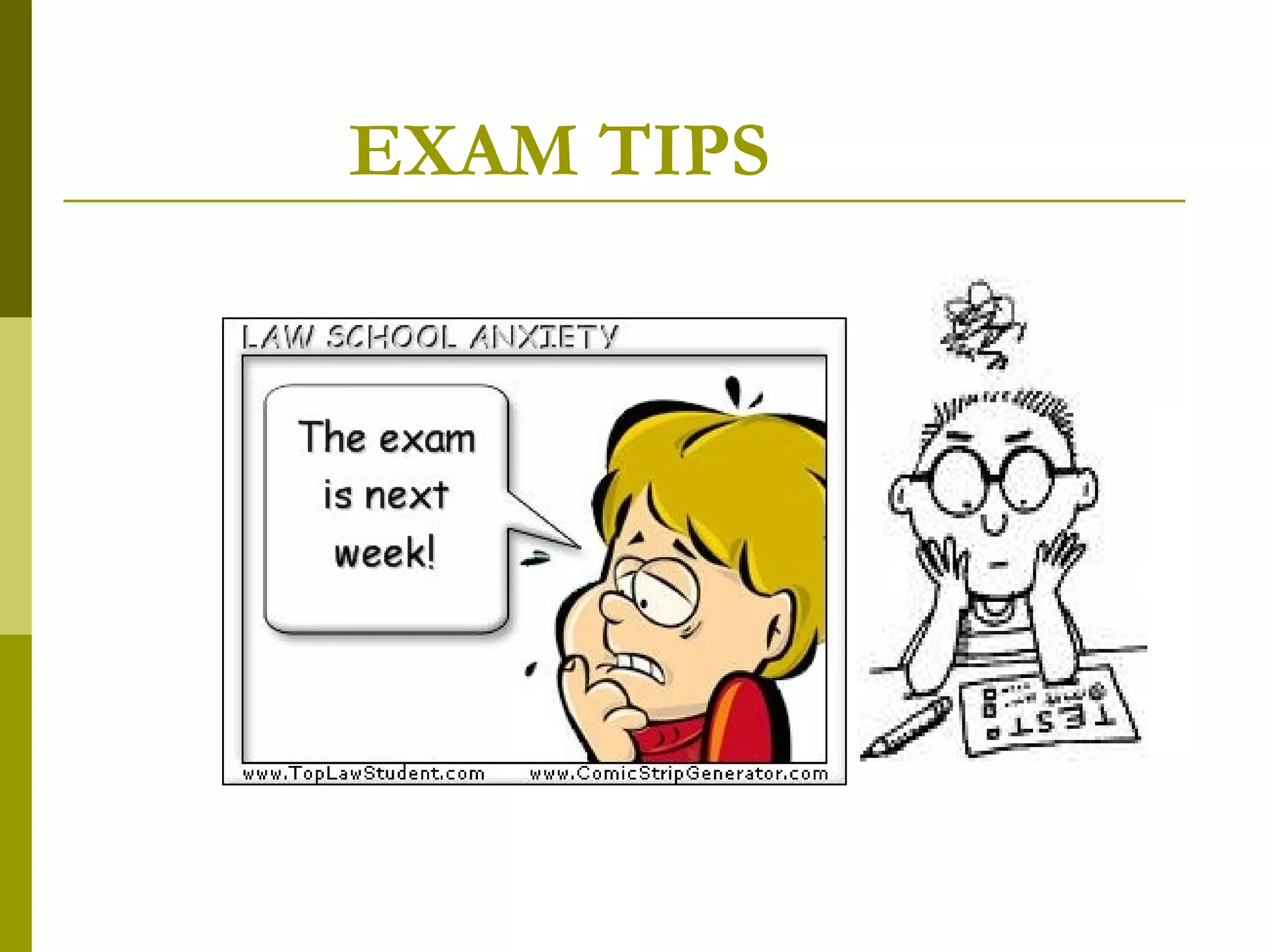 The document provides exam tips for students taking an exam. It recommends relaxing and being confident to avoid stress and nerves. For listening, listen once to get the general idea and key words, and do not try to complete activities from the first listening. The exam has three parts: multiple choice, matching or true/false, and fill in the blanks. For reading, it also has three parts and takes time but is not difficult. For writing, write clearly and separate paragraphs, write what is asked and check grammar and spelling before submitting. For speaking, relax and focus on speaking partner, speak English only and the teacher is a friend who praises effort.