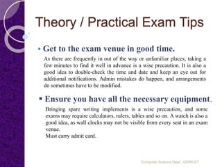 This document contains exam tips and instructions to help students prepare for and take their practical and theory annual exams. It provides tips such as arriving at the exam venue early, bringing the necessary equipment like writing implements and calculators, reading all instructions and questions carefully, planning answers before writing, allocating time appropriately between sections, ignoring what other students are doing, and not panicking if running out of time. The overall goal is to help students successfully complete their exams.