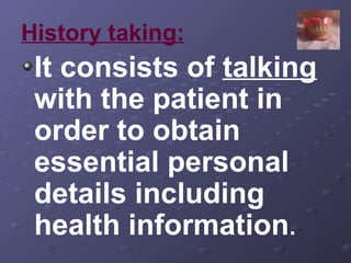 This document provides guidance on the examination, diagnosis, and treatment planning process for complete denture prosthodontics. It outlines the various components of patient history taking and clinical examination that are important to assess, including medical history, extraoral examination, intraoral soft tissue and residual ridge examination, radiographs, and mental attitude assessment. Factors such as age, gender, occupation, chief complaint, systemic diseases, neuromuscular function, saliva, arch size and shape, interarch relationship, and existing dentures are evaluated. The results of this process inform the treatment plan, which is discussed with the patient, and prognosis is determined.
