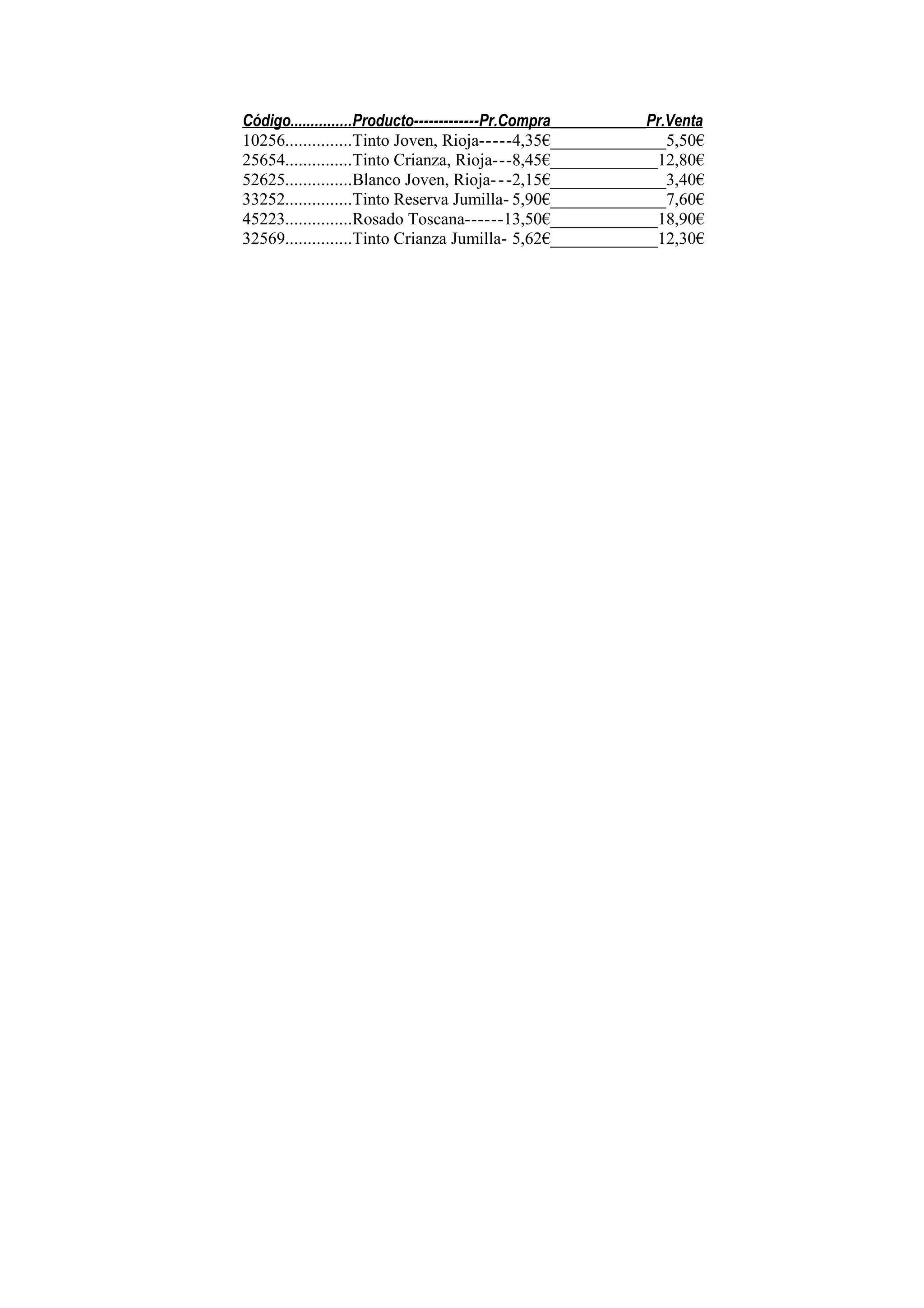 This document contains a list of wine products with their corresponding codes, descriptions, purchase prices, and sale prices. It includes both red and white wines from Rioja and Jumilla in Spain as well as a rosé wine from Toscana, Italy. The purchase and sale prices are listed in euros for each item.
