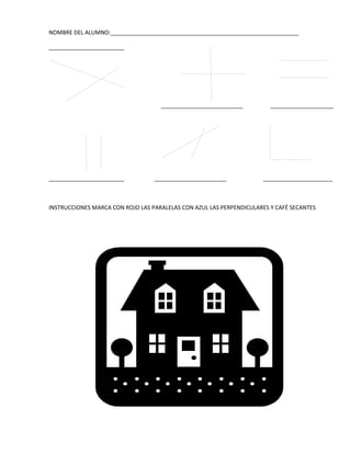 This Spanish document appears to be a student worksheet asking the student to identify and mark parallel, perpendicular, and secant lines in different colors. The student is asked to mark parallel lines in red, perpendicular lines in blue, and secant lines in brown.