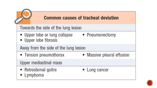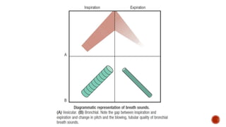 This document provides guidance on examining the respiratory system through history taking and physical examination. It details what to ask patients regarding symptoms like breathlessness, cough, sputum production, and chest pain. It also explains how to inspect, palpate, percuss and auscultate the chest. Specific tests are described like measuring chest expansion, examining neck veins, and evaluating breath sounds and vocal fremitus. A thorough respiratory exam provides clues to underlying cardiopulmonary conditions.