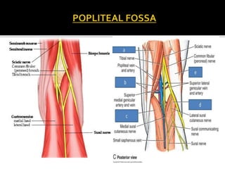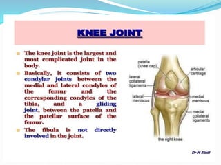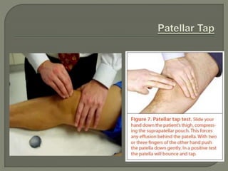 The document summarizes the anatomy, biomechanics, clinical examination, and tests of the knee joint. It describes the bony structures, ligaments, muscles, and nerves involved in the knee. It outlines the typical symptoms of knee pathology and positions for examination. Examination techniques are discussed including inspection, palpation, range of motion testing, measurements, and special tests to evaluate ligaments and menisci. Common stability tests for the ACL, MCL, LCL, and tests for meniscal tears and recurrent dislocation are summarized.