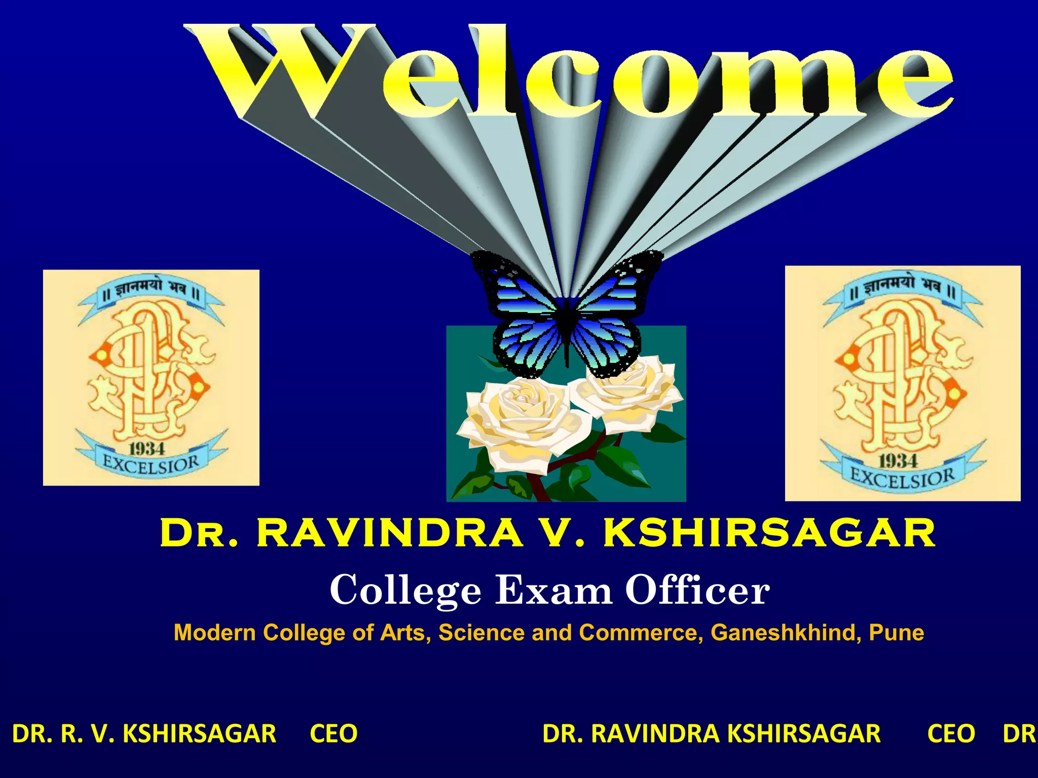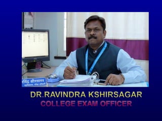 Dr. Ravindra Kshirsagar is the College Exam Officer at Modern College of Arts, Science and Commerce in Pune, India. He discusses examination objectives like evaluation, inspection, and analysis. Program outcomes and course outcomes are defined to outline the knowledge, skills, and attitudes students should have upon graduation. Formative and summative evaluations are used in semester and annual examination patterns. Innovative practices include online seating arrangements, diagnostic tests, and special software for timely exam results declaration. Workshops are also conducted to reform examinations.