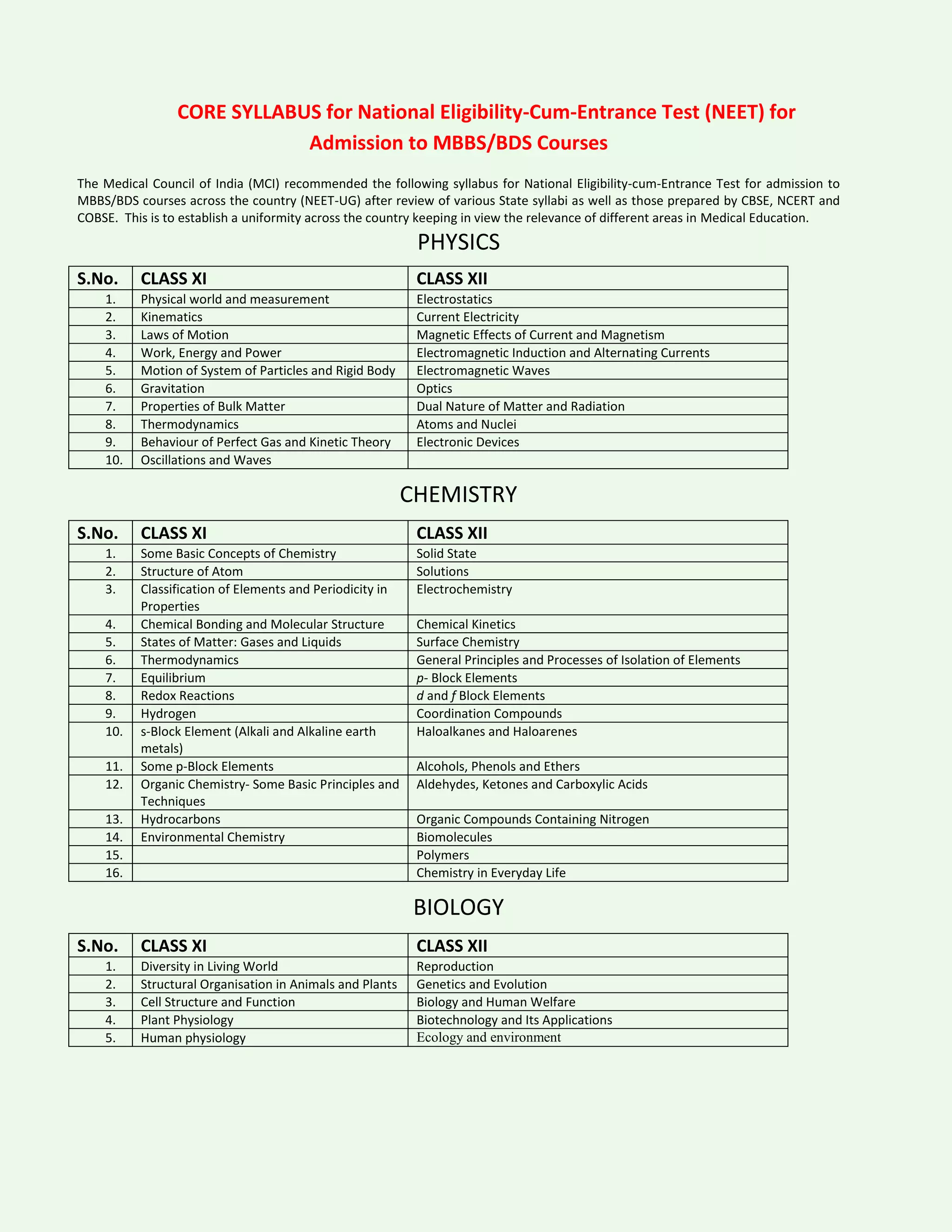 The document provides the core syllabus for the National Eligibility-Cum-Entrance Test (NEET) for admission to MBBS/BDS courses across India. It outlines the recommended syllabus for Physics, Chemistry, and Biology in Classes 11 and 12. The syllabus covers topics such as physical world and measurement, laws of motion, electrostatics, chemical bonding, states of matter, thermodynamics, atomic structure, biomolecules, and ecology. The Medical Council of India developed this uniform syllabus to establish consistency in medical education entrance exams across the country.