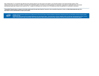 This score report indicates that the examinee passed the Special Education EC-12 certification exam with a total scaled score of 242. The report provides details on the number of questions and correct answers in each competency domain. It notes that examinees have five total attempts to pass certification exams and explains where to find more information on understanding score reports. The report also provides instructions for applying for certification after scores have been posted.