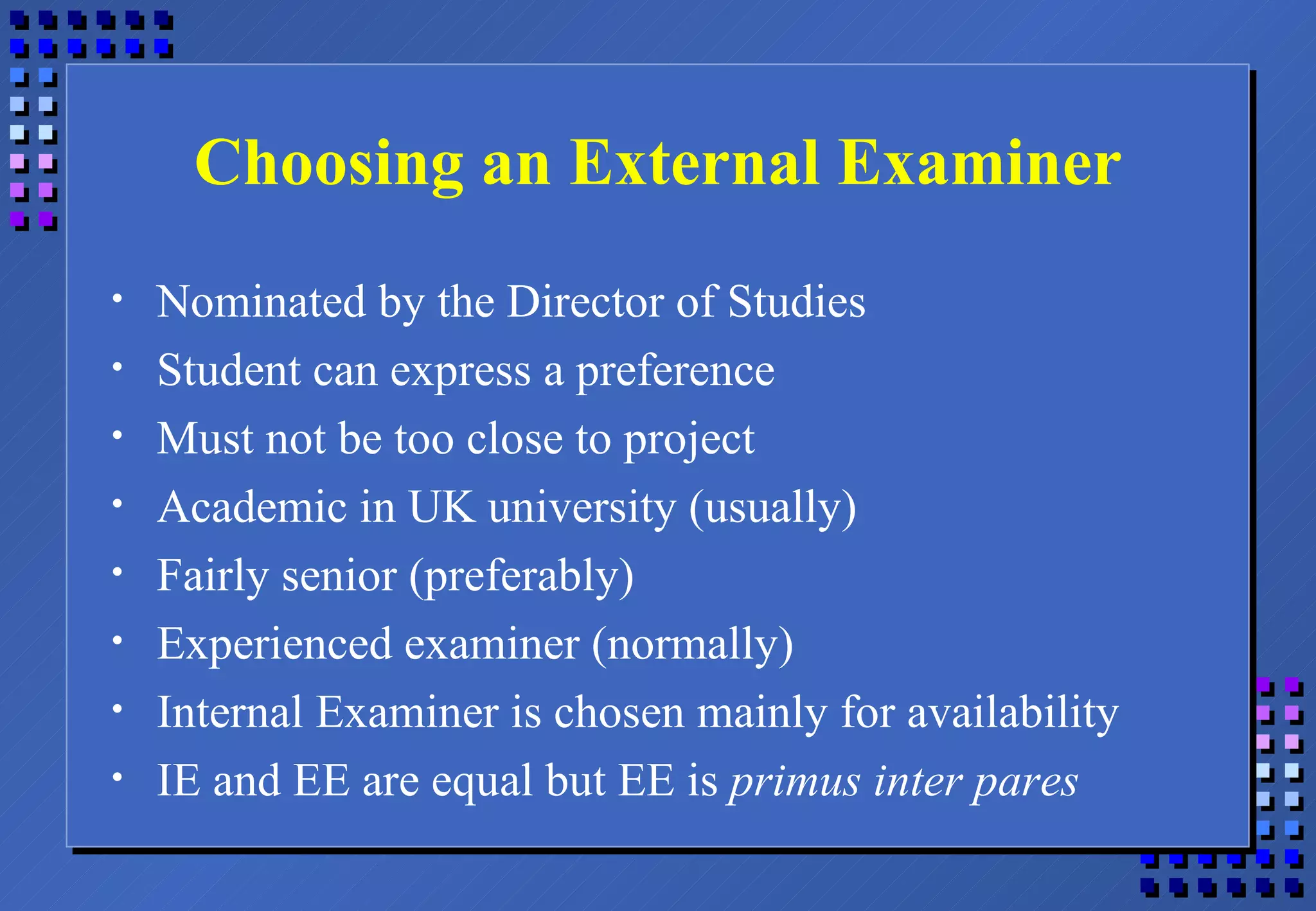 The document discusses the process of examining a higher degree thesis from the perspectives of both the student and external examiner. It provides guidance for students on choosing an external examiner and preparing for the viva voce exam. Key advice includes making the thesis clear and interesting for an examiner with limited time, building the examiners' confidence to pass the student, and avoiding criticisms of other researchers or unsupported claims. The goal of the viva is to improve any initial opinion based on the written thesis and allow the examiners to feel confident enough in recommending the student passes.