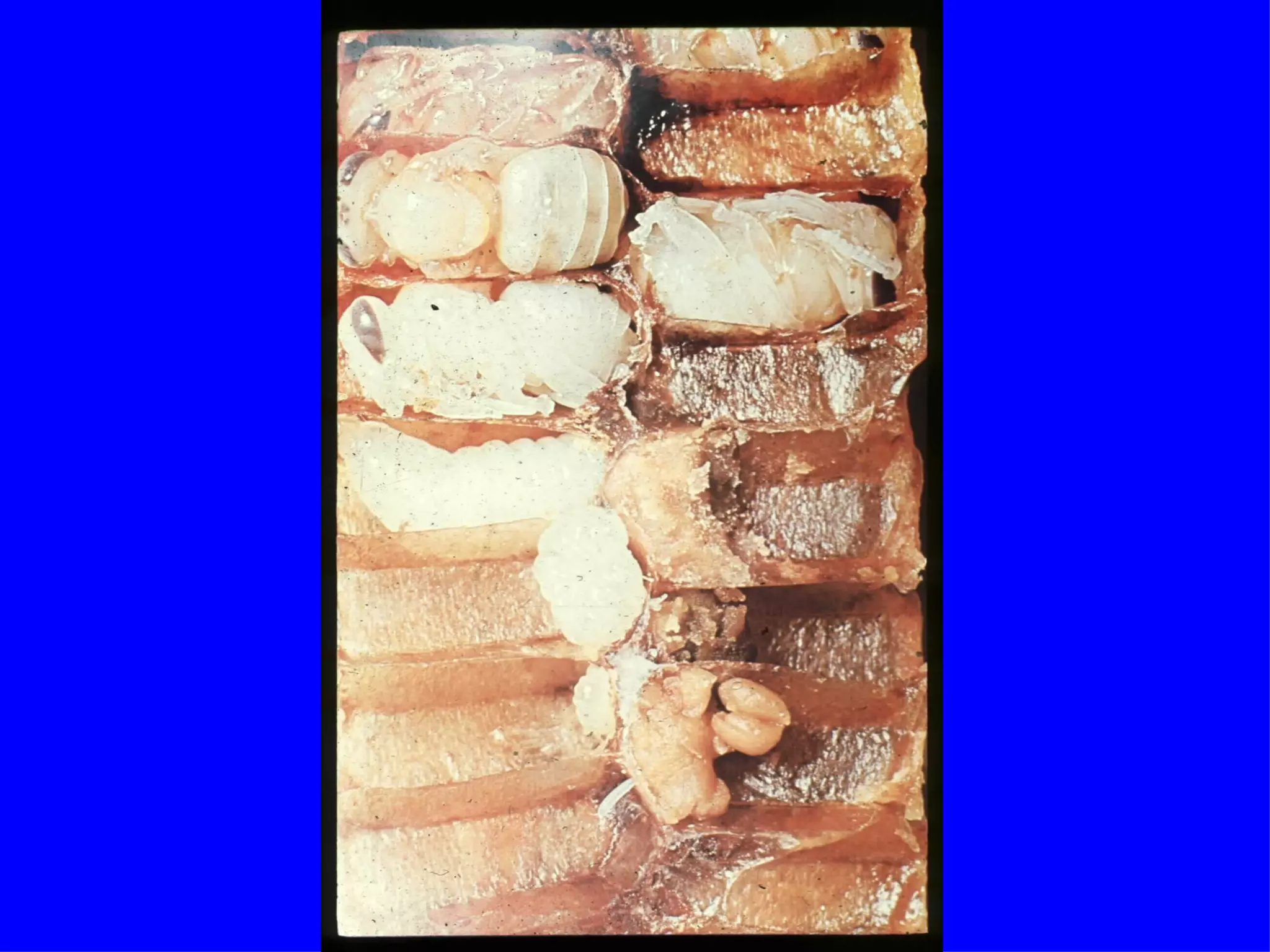The document discusses examining bee combs to determine the condition of bee colonies. It notes that the brood nest is where signs of trouble are often first found, and outlines functions of combs like reproduction, food storage, and orientation points. It emphasizes the importance of proper comb arrangement and discusses signs that can be read from brood patterns like queen quality, food stores, and diseases. It provides examples of damaged and abnormal combs and explains how combs can serve as disease reservoirs.