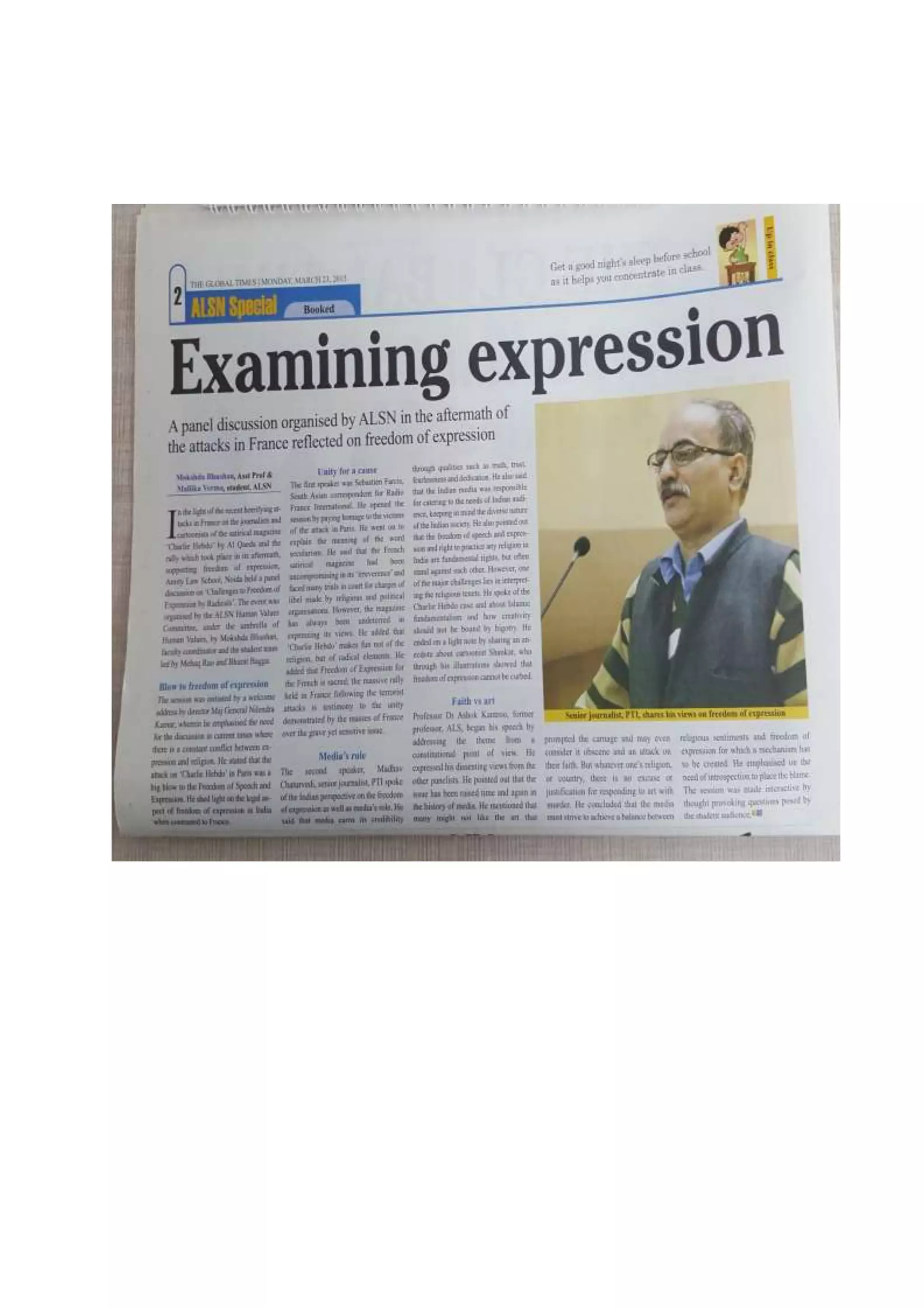 A clipping from The Global Times, Monday, March 23, 2015, Page 2 issue carrying a report of a panel discussion organized by Amity Law School, Noida in the aftermath of the attacks in France and its reflection on the freedom of expression.