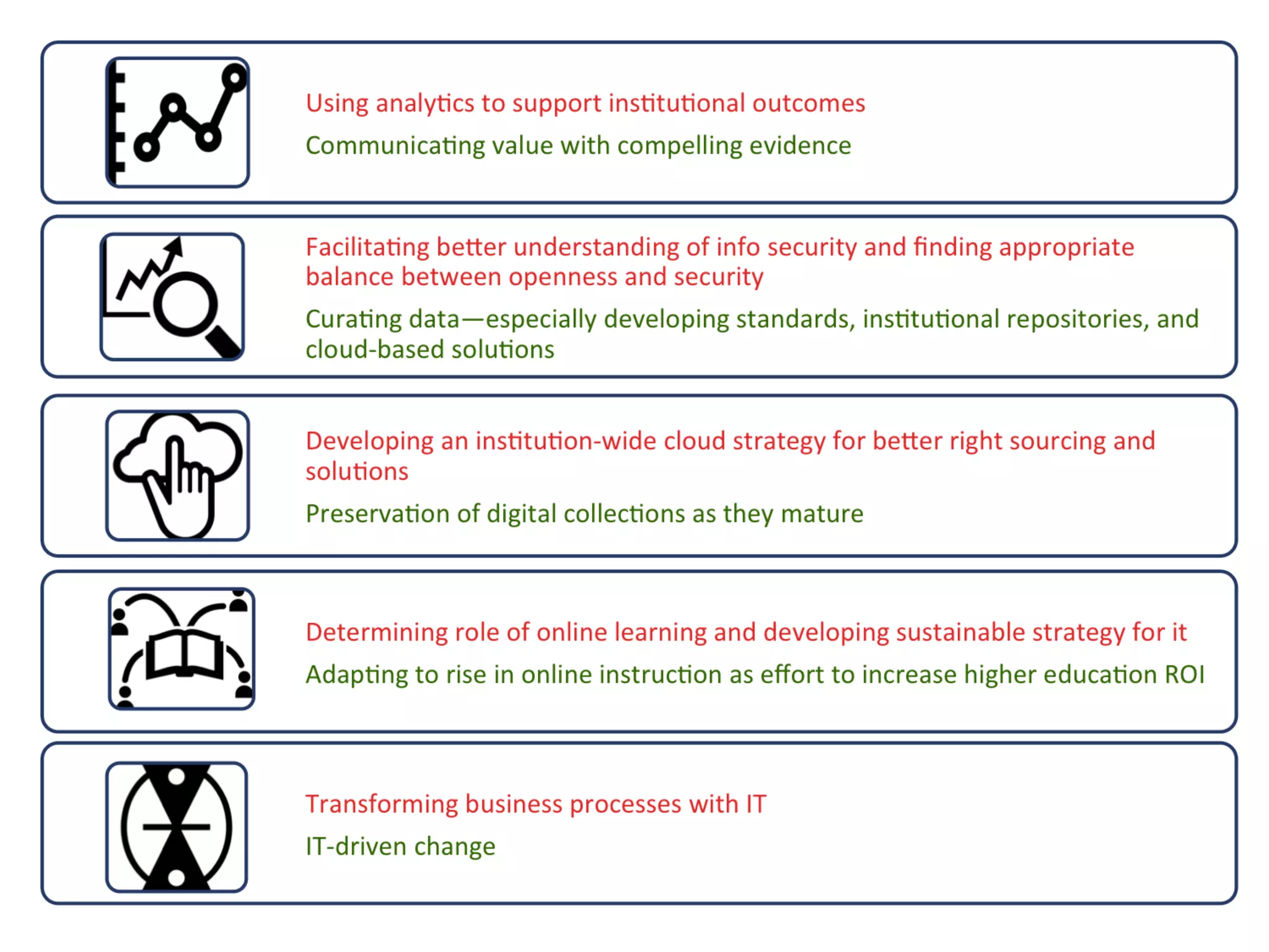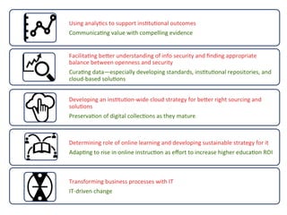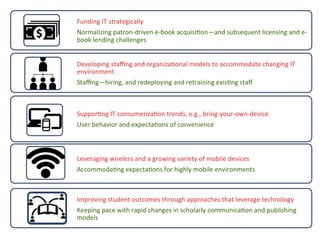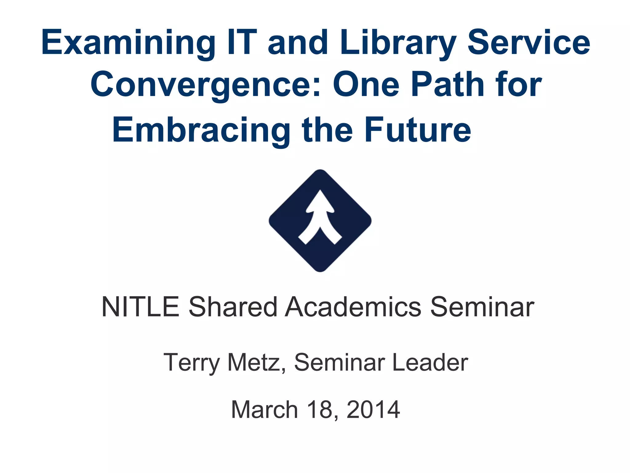 The document discusses the convergence of IT and library services in higher education, focusing on how institutions can adapt to changing environments through collaborative relationships. It outlines challenges, benefits, and conditions for readiness regarding this convergence, emphasizing the need for efficient resource use and improved user experiences. Additionally, it highlights successful examples and suggests steps for fostering collaboration and integration between IT and library staff.