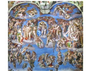 The document lists important Renaissance works by Michelangelo, Bramante, Giovanni Bellini, and Correggio. Michelangelo is credited with David from 1501, the ceiling of the Sistine Chapel from 1508-1512 including the Last Judgement, and work on St. Peter's Basilica from 1546-1564. Bramante designed the Tempietto in 1502. Giovanni Bellini painted the Virgin and Child Enthroned with Saints in 1478. Correggio's Assumption of the Virgin dates from 1526-1530.