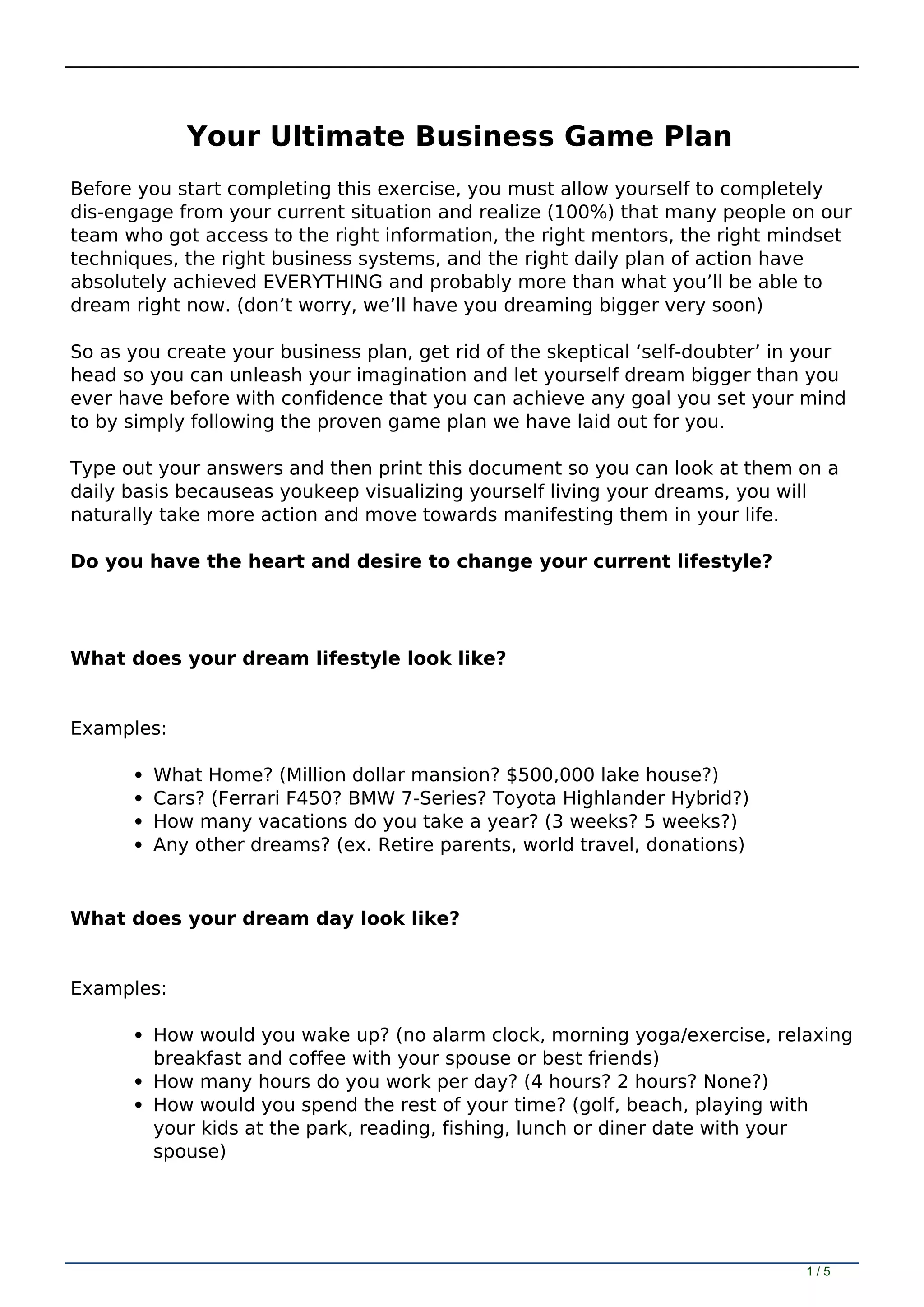 This document outlines a business game plan to help readers achieve their dream lifestyle within 3-6 months. It instructs readers to first visualize their dream lifestyle and income goals. It then recommends positioning oneself at the highest membership level to maximize earnings per sale. Readers are advised to set up automated marketing systems and leverage done-for-you traffic sources. The plan also includes daily blogging, personal development, and marketing activities to learn skills and generate leads. Following this comprehensive game plan of visualizing goals, maximizing earnings, automating systems, and taking consistent action is posited to help readers achieve their lifestyle dreams quickly.