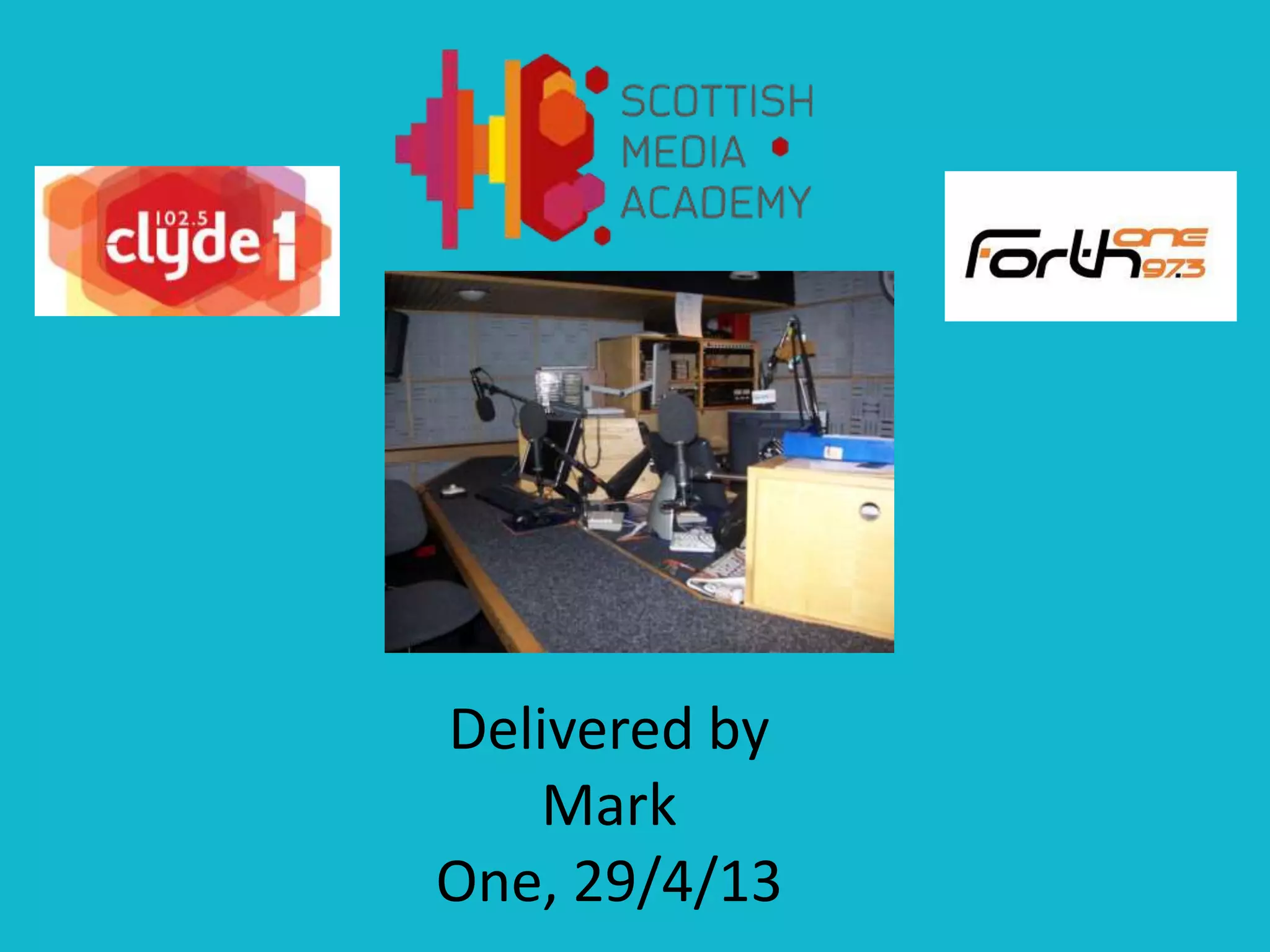 One, this document provides information about Bauer Media, a media company that owns radio and television stations across 15 countries. It discusses several radio presenters in Scotland, including Boogie and Arlene from Forth One breakfast, Grant Stott who believes anyone can get into media, and Billy Briggs, an award-winning freelance journalist. It also mentions Mark Martin, who presents a network radio show across Bauer stations and assisted students during a live radio show preparation where he took on the role of Programme Controller.