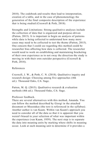 The document outlines two methodological designs for phenomenological research focusing on the experiences of burnout among direct support professionals and the adjustment to motherhood as working board-certified behavior analysts. It emphasizes the qualitative analysis process, including data organization, coding, and interpretation, while also discussing strengths and limitations of these methodologies. The text highlights the importance of minimizing researcher bias and operationalizing constructs in qualitative studies, particularly in transpersonal psychology.