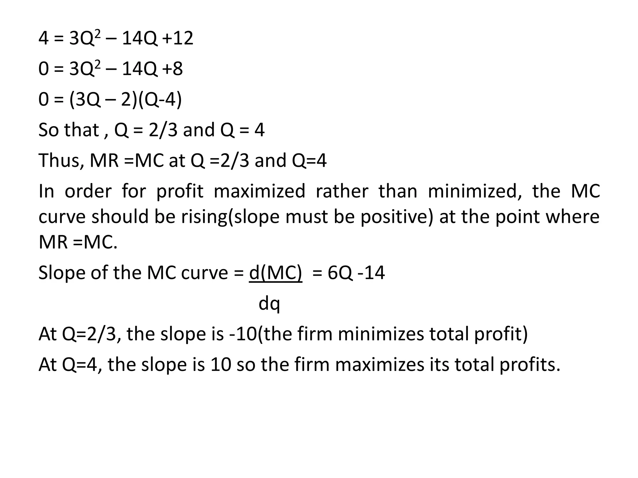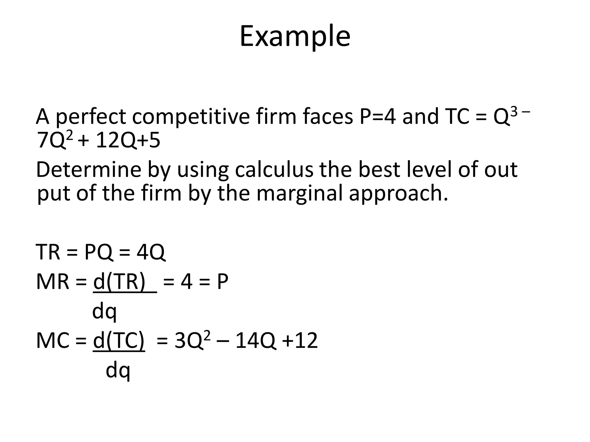 The document uses calculus to determine the profit-maximizing level of output for a firm in perfect competition facing a price of $4 and total costs of Q3 – 7Q2 + 12Q+5. It finds the marginal revenue is $4 and sets marginal cost equal to marginal revenue. This yields two possible output levels: 2/3 and 4. However, only at 4 is the slope of the marginal cost curve positive, indicating profit maximization. The total profit at this optimal output of 4 is calculated to be $11.