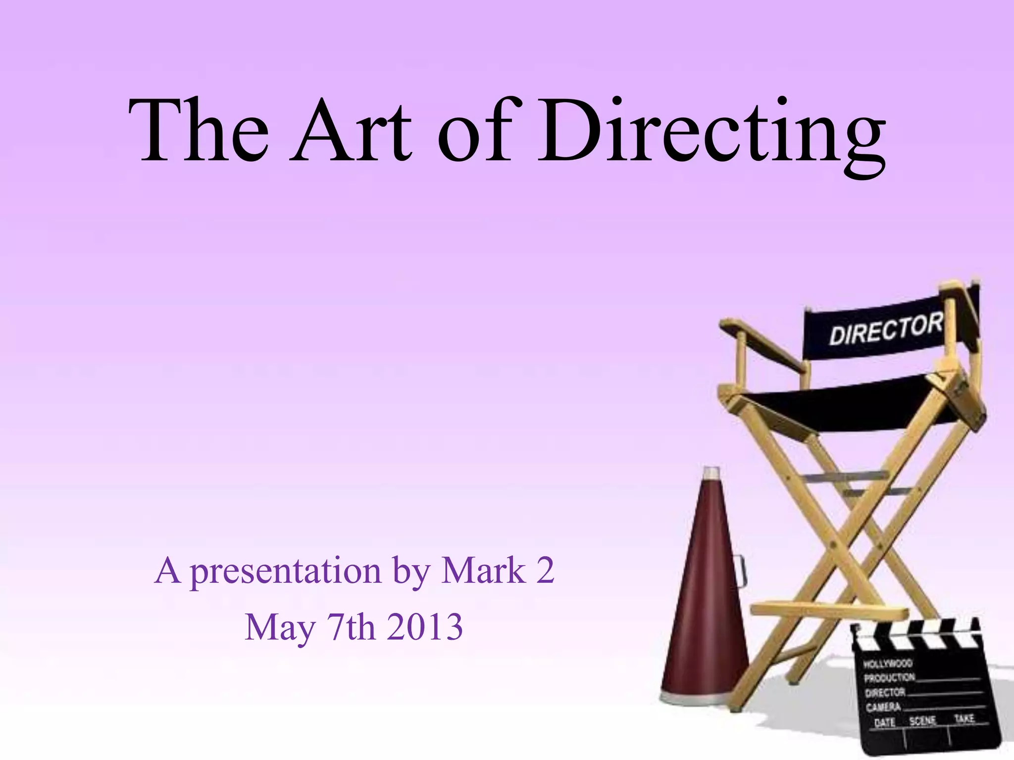 The presentation discusses the essential skills of a director including artistic vision, creativity, and motivation skills. It outlines a director's main responsibilities such as selecting cast and crew, involvement in editing, and bringing their vision to the screen. Examples are given of some of the presenter's favorite directors including Steven Soderbergh, Peter Jackson, and Bradley Buecker.