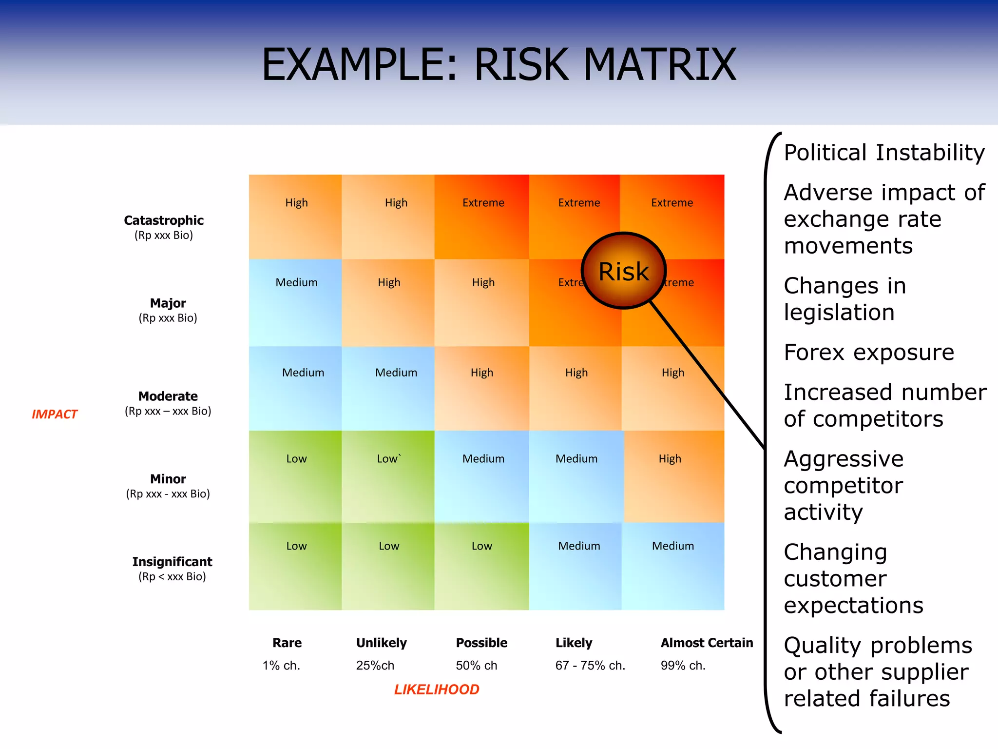 This document presents a risk matrix that evaluates different risks on two criteria: the likelihood of each risk occurring and its potential impact. The matrix assigns qualitative labels like "low", "medium", and "high" to indicate the level of risk for different scenarios based on the crossing of likelihood and impact. It also provides examples of specific risks that could be analyzed using this framework, such as political instability, exchange rate movements, changes in legislation, and issues relating to competitors, customers, and suppliers.