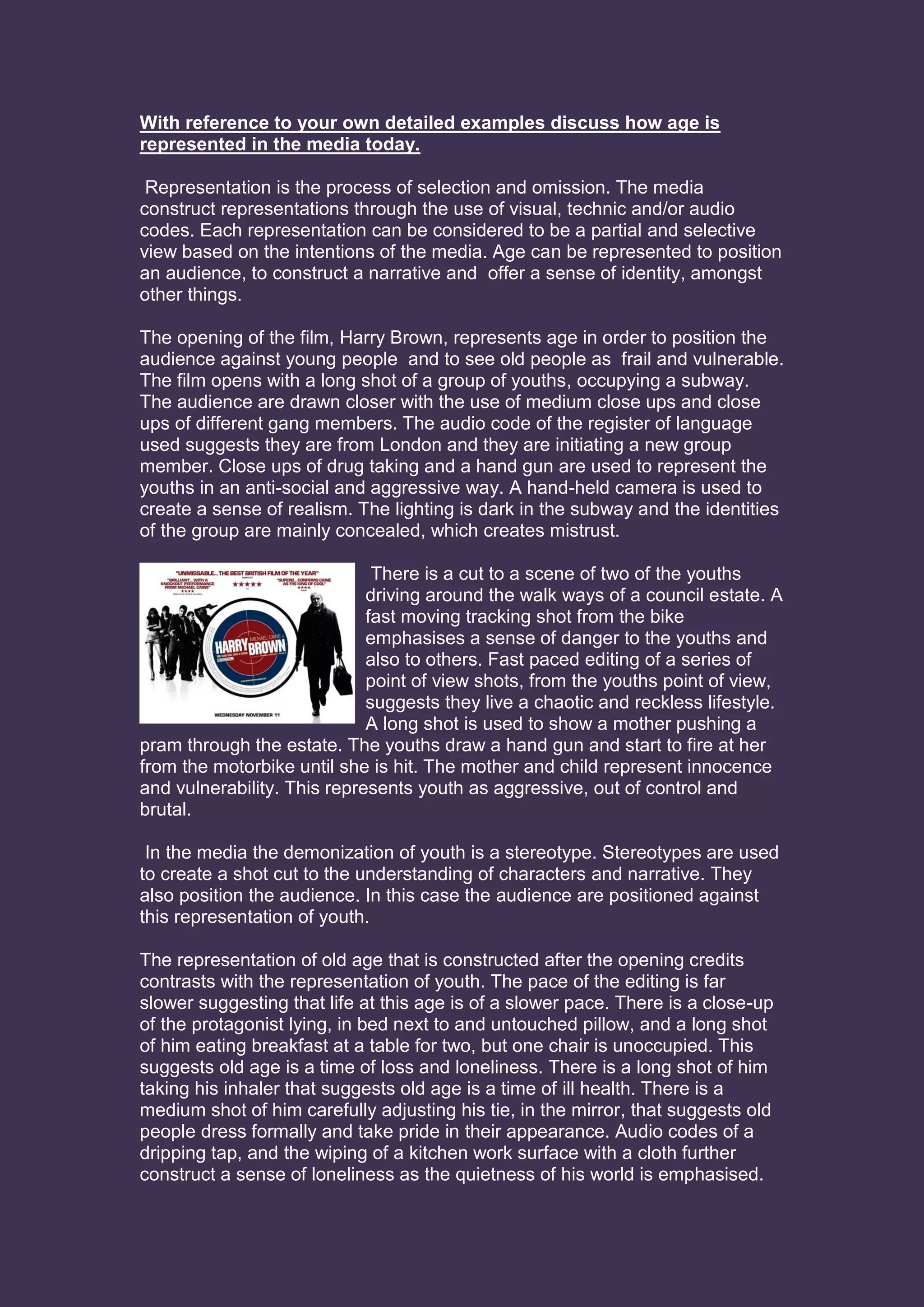 The document discusses how age is represented in media today through examples from films and advertisements. It begins by explaining that representations are selective views used to position audiences and construct narratives. It then analyzes how the opening of the film "Harry Brown" represents youth as dangerous criminals to position the audience against them, while the elderly main character is shown as vulnerable. Next, it examines a McDonald's ad that contrasts youth and old age but brings them together harmoniously. Finally, it discusses how the cover of Seventeen magazine represents teenage girls as concerned with appearance, fashion, and relationships to offer them an identity and ideology. Overall, the document argues that media uses selective representations of age for different purposes like audience positioning, narrative construction, and targeting