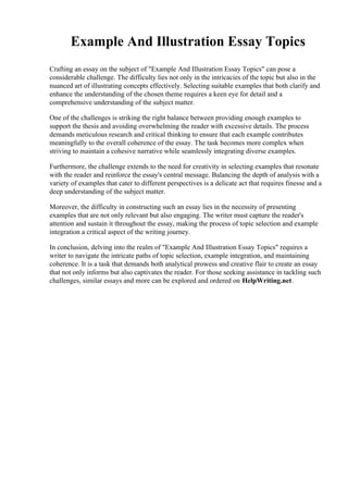 Writing an effective example and illustration essay poses several challenges. The writer must select examples that clearly explain the topic without overwhelming the reader. Examples need to support the thesis cohesively while maintaining a narrative flow. Balancing depth of analysis and catering to different perspectives requires finesse. The examples must also engage readers by capturing and sustaining their attention. Crafting such an essay is an intricate process that demands both critical thinking and creative skills to inform and captivate the audience.