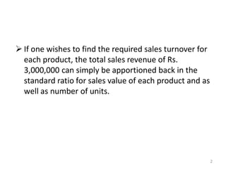 The document discusses break-even analysis for a company that produces three milk products: cream milk, soft milk, and fluff milk. It provides budgeted production, selling price, and variable cost data for each product. The total fixed cost for the year is budgeted at Rs. 1,200,000. To calculate the break-even point, the total sales revenue of Rs. 3,000,000 is apportioned to each product based on its percentage of total sales value and units. This results in break-even sales levels of Rs. 900,000 for cream milk, Rs. 1,500,000 for soft milk, and Rs. 600,000 for fluff milk.