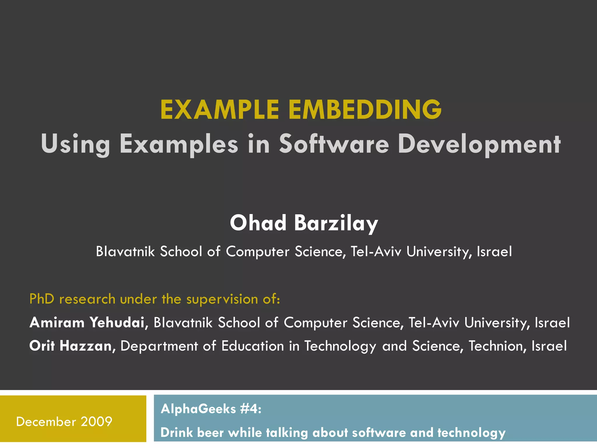 This document discusses using examples in software development. It argues that embedding existing code examples within new contexts (example embedding) can increase productivity if done habitually and correctly with the right tools and environment. Some benefits of example usage include faster coding, more reusable code, and promoting learning. However, barriers include a lack of awareness of examples, skills needed for embedding, trustworthy example repositories, and cultural/organizational issues. The document examines how to apply example embedding and proposes building example sets, reference applications, and using examples to address syntax errors or embed third-party code. It emphasizes the need for reflection on professional work and techniques.