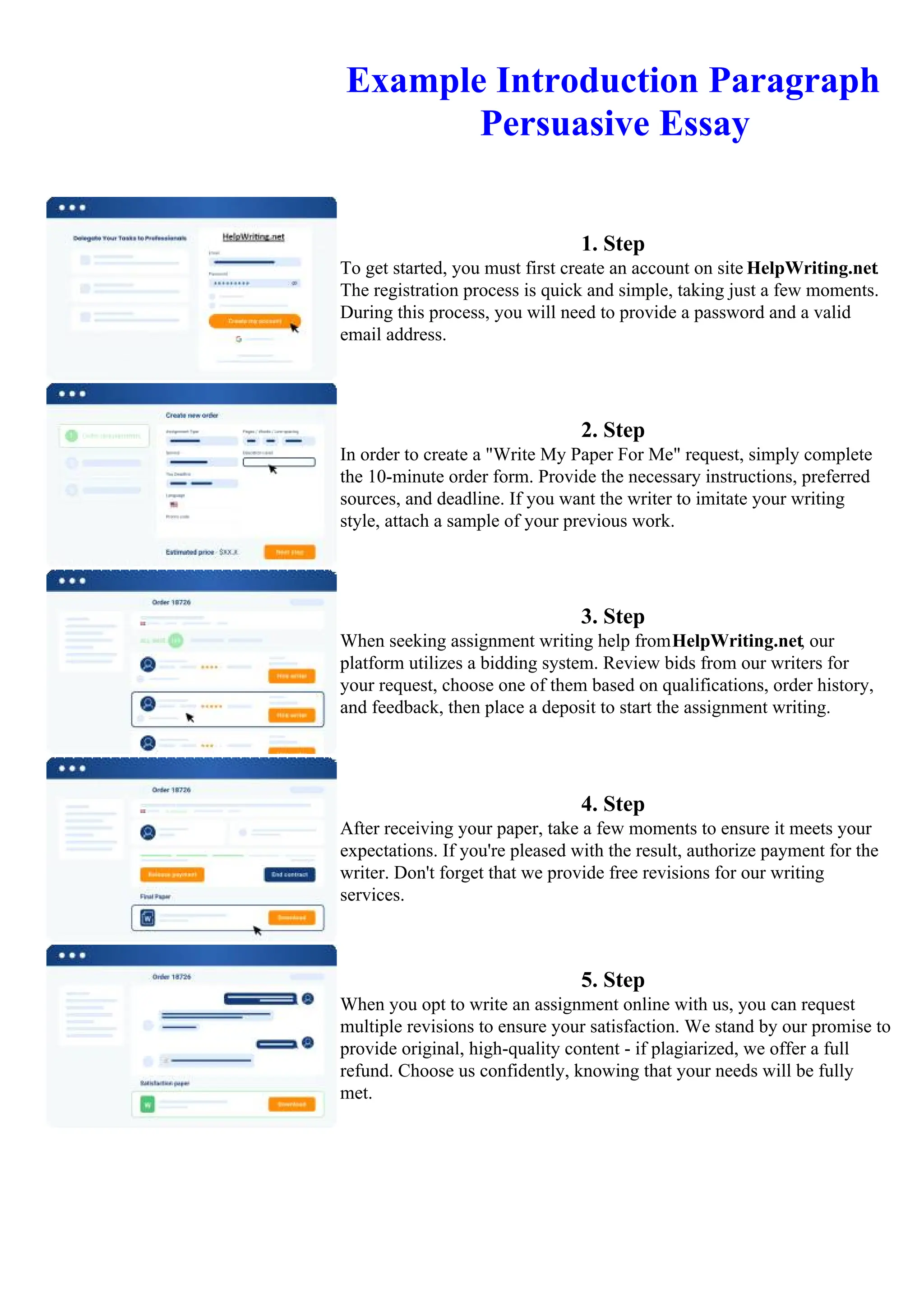The document provides steps for requesting writing assistance from HelpWriting.net, including creating an account, completing an order form, reviewing writer bids, authorizing payment, and requesting revisions. It notes the registration process is quick, the order form requests instructions and sources, writers are chosen based on qualifications and feedback, and revisions are offered to ensure satisfaction. Multiple revisions can be requested to fully meet customer needs.