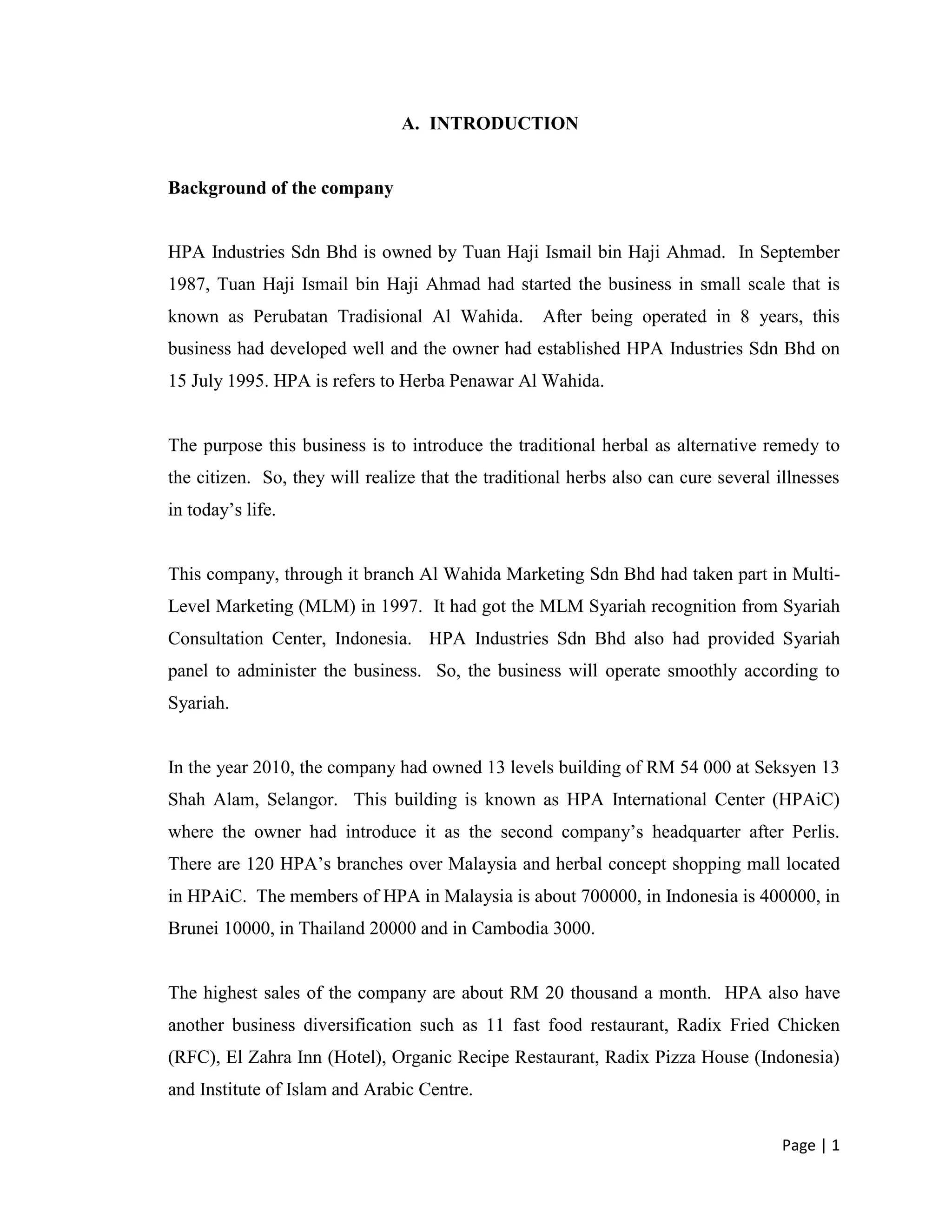 HPA Industries Sdn Bhd, founded in 1995 by Tuan Haji Ismail bin Haji Ahmad, specializes in herbal products and multi-level marketing (MLM) with a focus on Shariah compliance. The company has expanded its offerings to over 300 products, including health supplements, food, and services like cupping and acupuncture, while also operating numerous restaurants and hotels. HPA aims to be a leading producer in the herbal industry through innovative and diversified product development, marketing strategies, and entrepreneurial training.