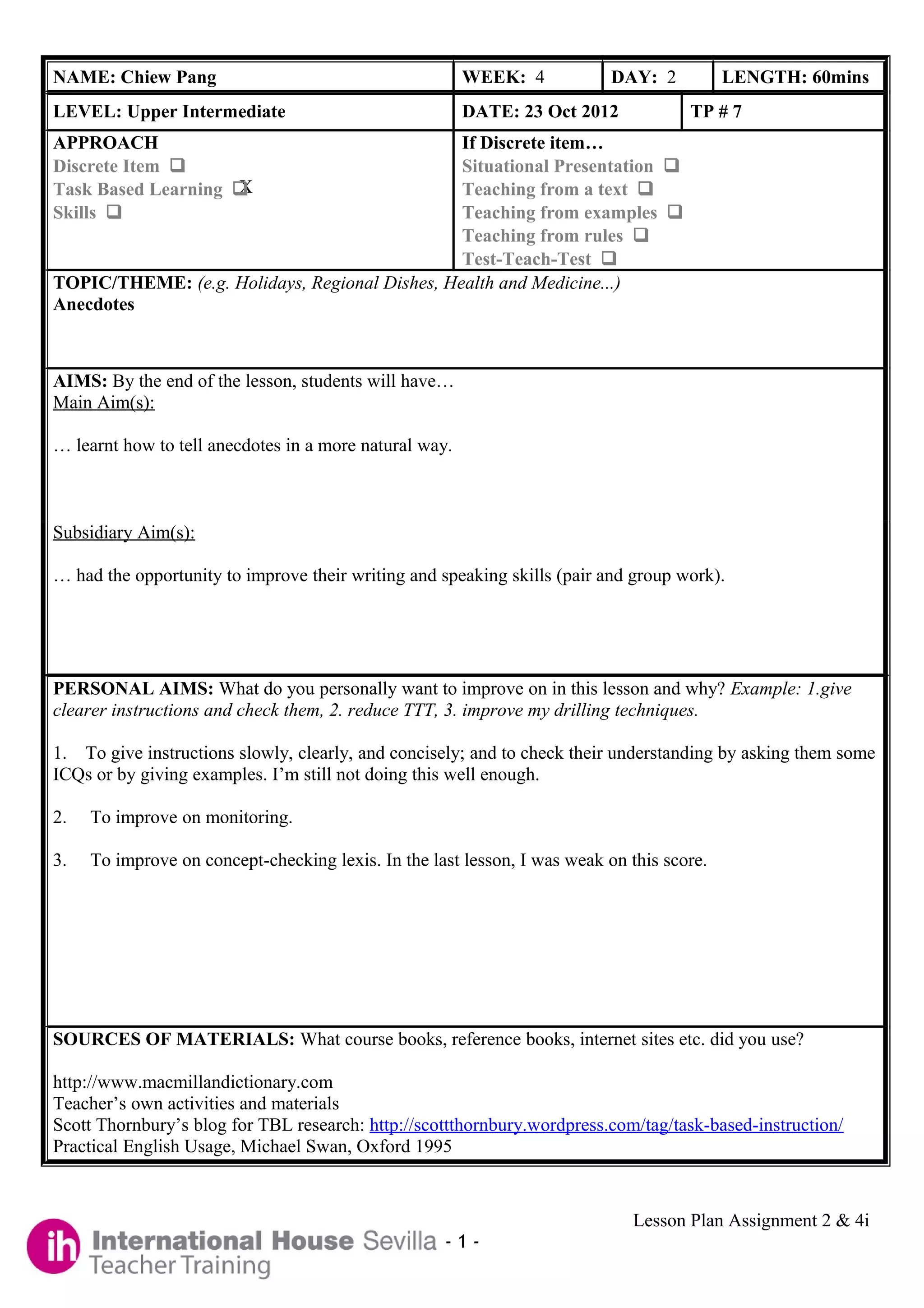 The document outlines a lesson plan for an upper-intermediate English class focusing on teaching anecdotes. It details the aims of the lesson, including improving students' writing and speaking skills, and includes analyses of the linguistic components such as meaning, form, pronunciation, and appropriacy of specific lexis. Additionally, it discusses anticipated problems and solutions related to language comprehension and classroom management.