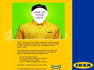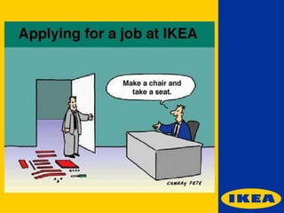IKEA is a Swedish furniture retailer with branches in 41 countries that aims to provide affordable home furnishings and create a better life for customers. It has been recognized as a top employer, focusing on cultural fit over skills alone in recruitment. IKEA promotes from within, offers on-the-job and online training, standardized global compensation, and surveys employees to solicit feedback. These human resource practices have helped IKEA build a strong culture with lower turnover than competitors, sustaining its growth as a preferred retail employer.