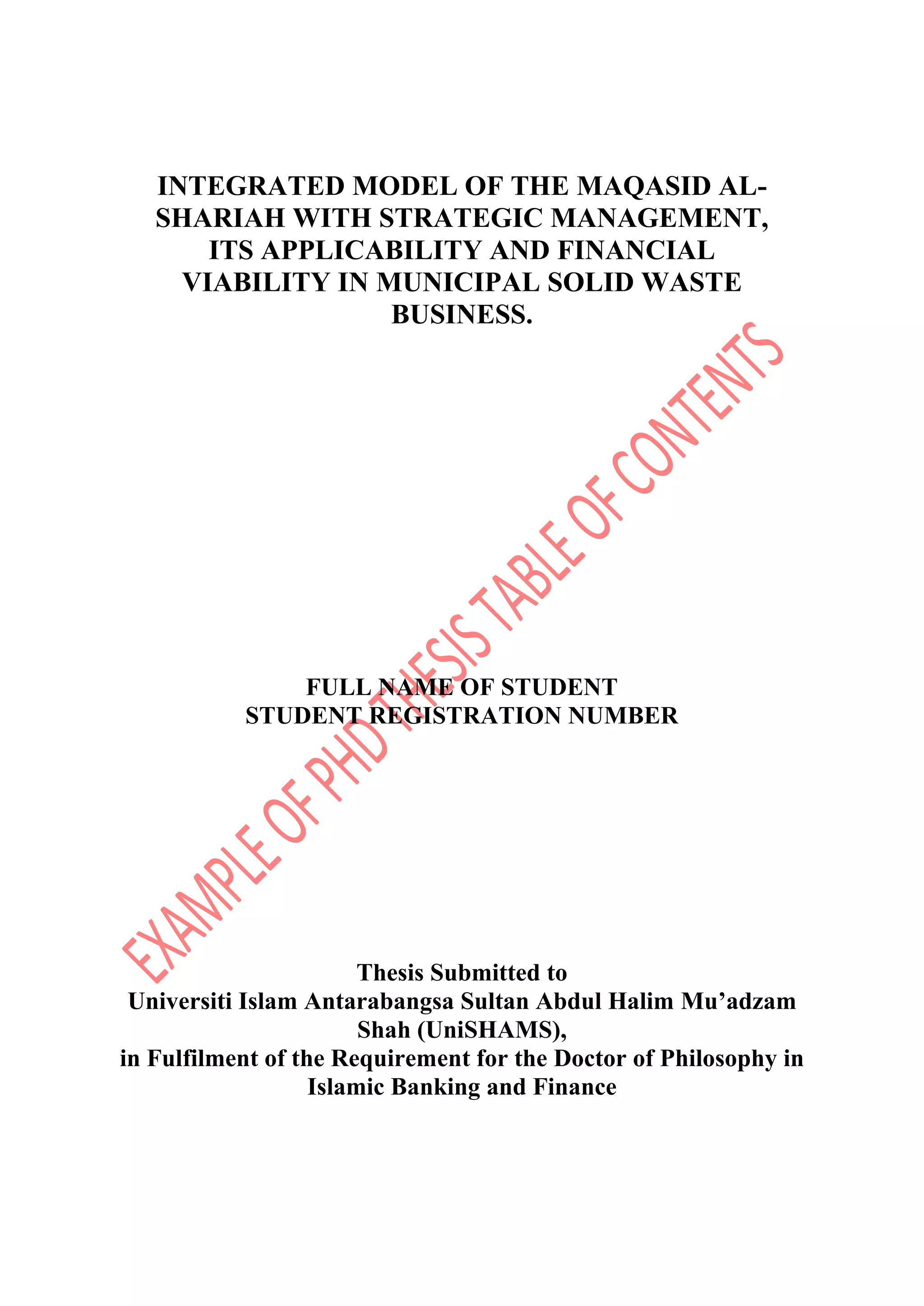 This document appears to be a thesis submitted for a Doctor of Philosophy in Islamic Banking and Finance. It examines integrating the Maqasid al-Shariah (objectives of Shariah) with strategic management theory and assessing the financial viability of a municipal solid waste business venture when incorporating the Maqasid al-Shariah. The study aims to develop an integrated model of the Maqasid al-Shariah and strategic management, assess its applicability, and determine if a municipal solid waste recycling business aligned with this model would be financially viable. It utilizes both qualitative and quantitative research methods, including content analysis of texts on the Maqasid al-Shariah and strategic management, statistical